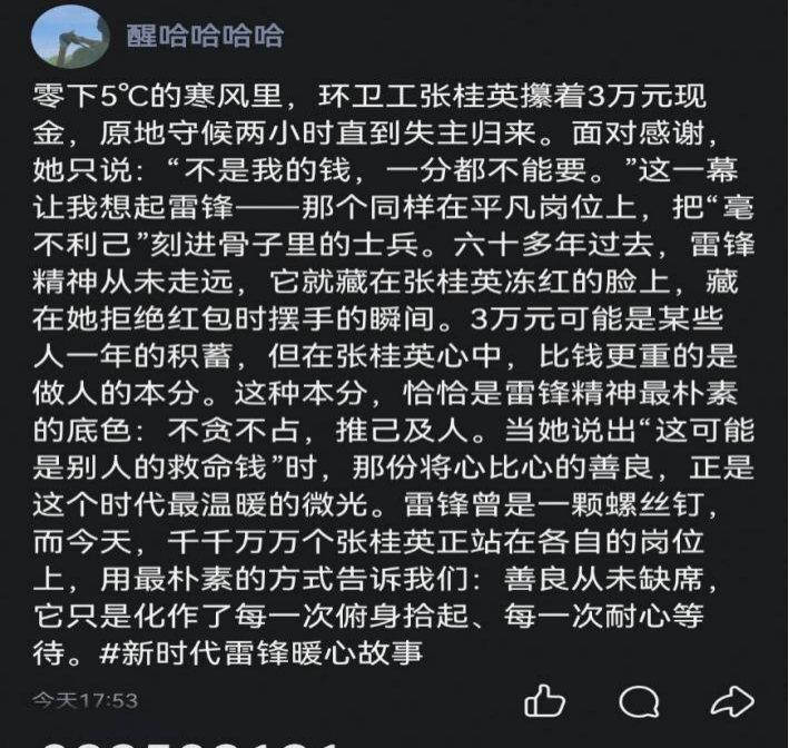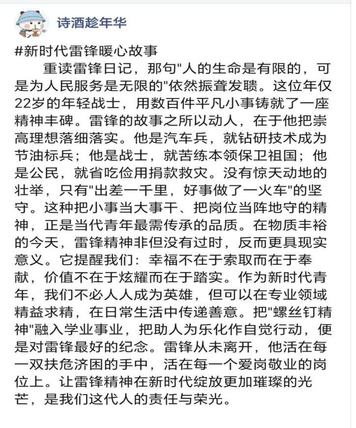 所有暖心故事均通过个人社交账号发布,用文字传递温暖与正能量。每一次分享都是一次精神传递,既让更多同学深入理解雷锋精神的时代意义,更以文字为纽带凝聚青年传承雷锋精神的共识,让雷锋精神在网络空间持续传播、焕发新生。