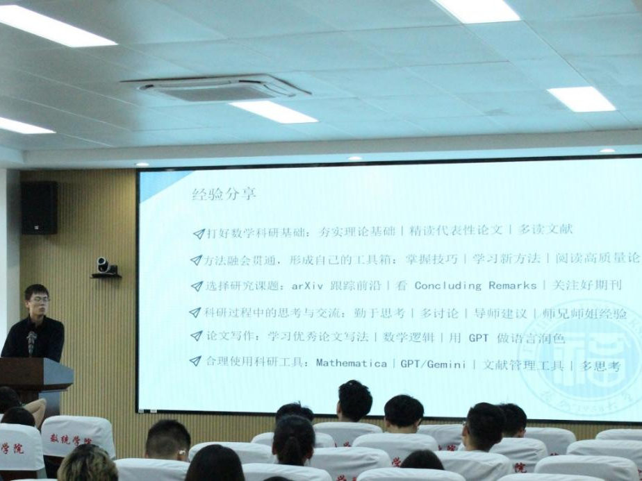 2023级博士研究生张一枭同学,围绕数学领域学术研究展开分享。他着重强调夯实数学基础对科研工作的重要意义,分享了文献阅读、课题挖掘、选题技巧、学术交流及论文撰写等核心环节的实施要点,并推荐了相关提升科研效率的实用工具,为不同阶段的学生提供了针对性的指导建议。