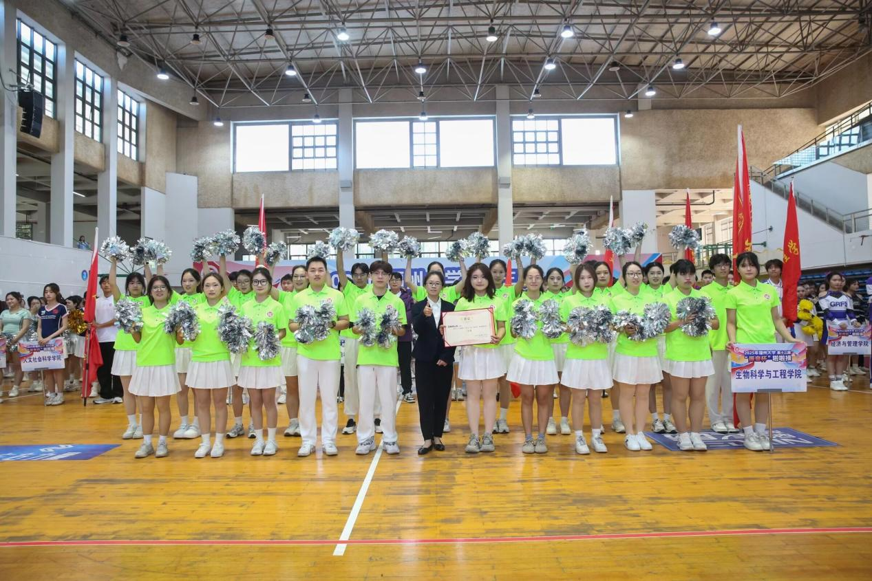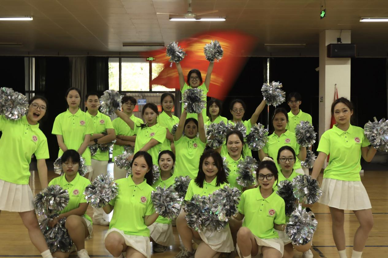 “Get Ready Go!”动感旋律一响起,队员们便切换至最佳状态。荧光绿色上衣搭配白色裙摆,亮眼配色既呼应明星AI学子探索未知的热忱,又尽显蓬勃朝气。花球挥舞划出灵动弧线,起落间满是活力;转身、托举、踢腿一气呵成,动作整齐划一,每一个节拍都踩得精准有力。队员们眼神坚定,笑容灿烂,将训练中扎实功底与团队默契配合展现得淋漓尽致,用热情与活力感染着现场所有人,成为赛场上一道亮丽的风景线。本次比赛成绩,既是对队员们辛勤付出的认可,更彰显了“精益求精、敢拼敢赢”的良好风貌!