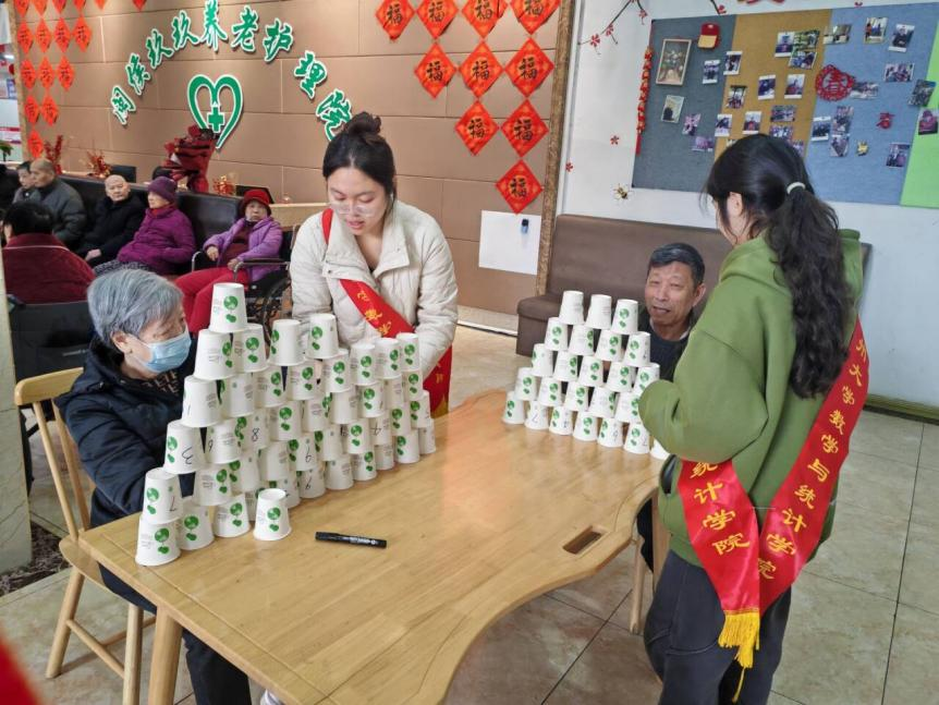 为了让老人们在互动中感受到快乐与陪伴,志愿者们与老人一起玩拼福马、叠纸杯、扭彩棒等趣味游戏,并精心准备文艺表演,将现场氛围推向高潮。熟悉的旋律、真挚的歌声,唤起了老人们心底的温暖回忆。