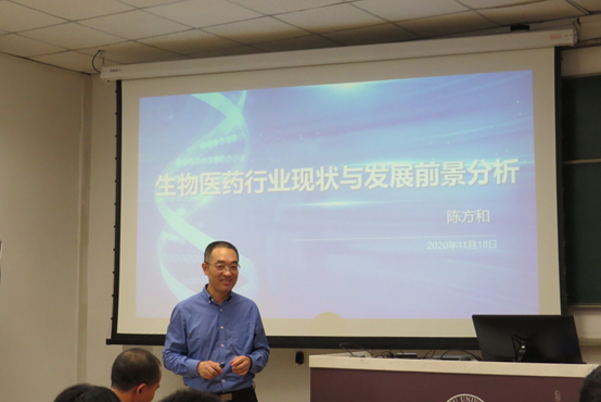 陈方和先生是厦门大学生物学系硕士、EMBA工商管理硕士,兼任福建省医药行业协会监事长等,对生物医药专业和市场营销等有着丰富职场经验。本次讲座上,他着重从生物医药概述、生物医药产业现状及发展前景分析、“生物人”职业发展的思考、厦门生物医药港--我可能的职业选择等四个方面,并结合他近30年的工作经历与同学们分享了 “生物人”的职业发展思考,并对基因工程药物、生物医药产业未来及生物医药带来的技术进步等进行了详细的阐述。同学们认真听讲,积极思考,踊跃提问,现场气氛热烈。