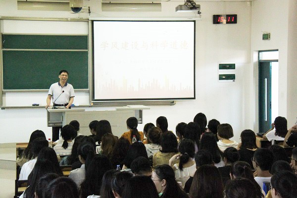 党委郑延平副书记在文1-405教室给2019级研究生新生上主题为“学风建设与科学道德”的思想政治教育课。