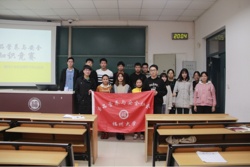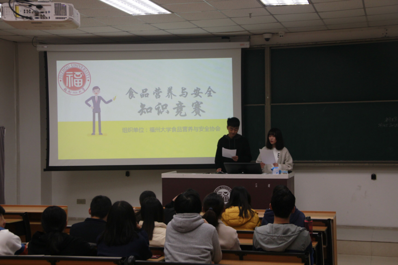 食安协会所举办的食品营养与安全知识竞赛决赛于西二—201教室正式开始。预赛所角逐出的八支队伍提前二十分钟尽数到场,完成签到后迅速坐到本队所在位置,等待着比赛的正式开始。