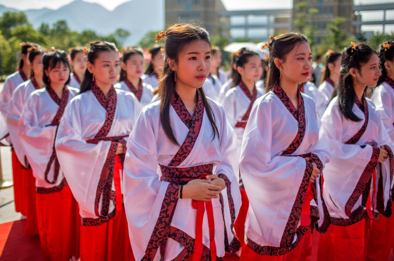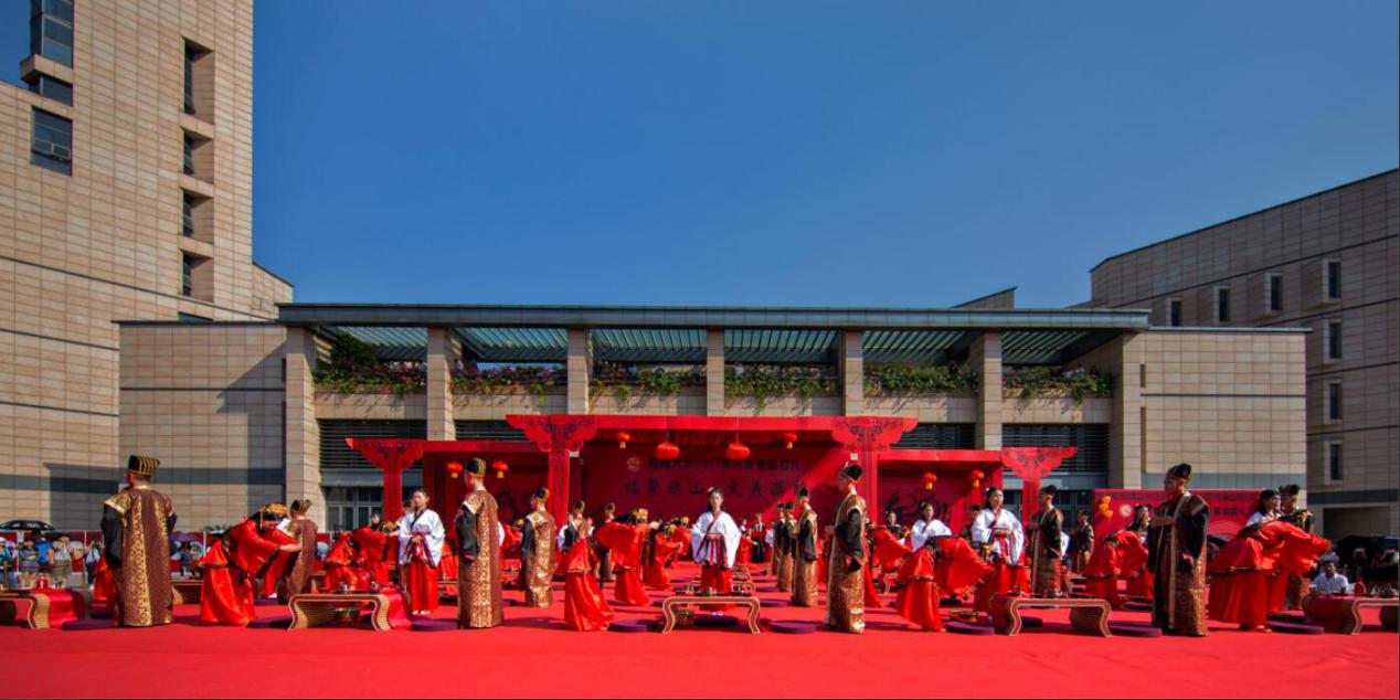 请看婚礼进行时——在校党委林生副书记讲话结束之后,“…执子之手,与子偕老…”,随着司仪颂赞辞结束后,执礼者入场。之后,众多新人身着汉代传统婚服,面带微笑,在悠扬礼乐的伴随下,缓缓入场。