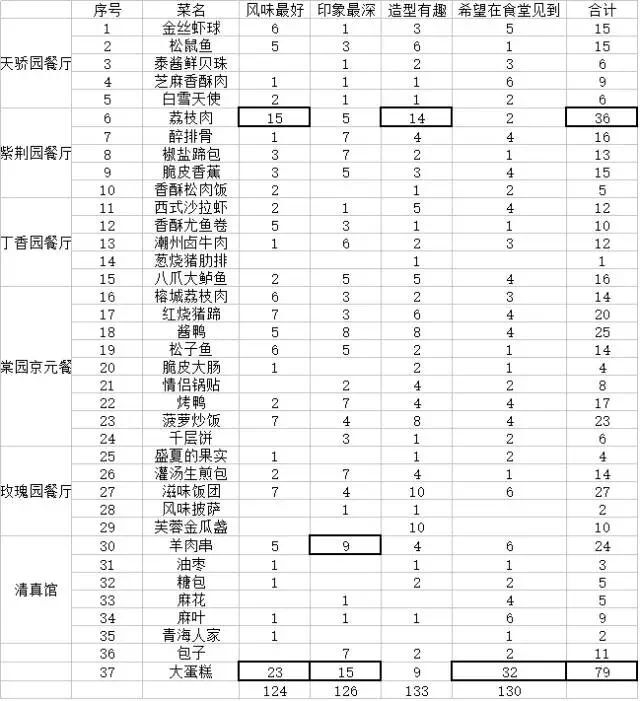 食品文化节后,由明星AI 参与食品文化节活动的老师与同学们对各食堂的菜肴进行了评价与投票。其中,鲜焙坊的大蛋糕总分最高。除蛋糕外,同学们评选出的风味最好的是紫荆园餐厅的荔枝肉,