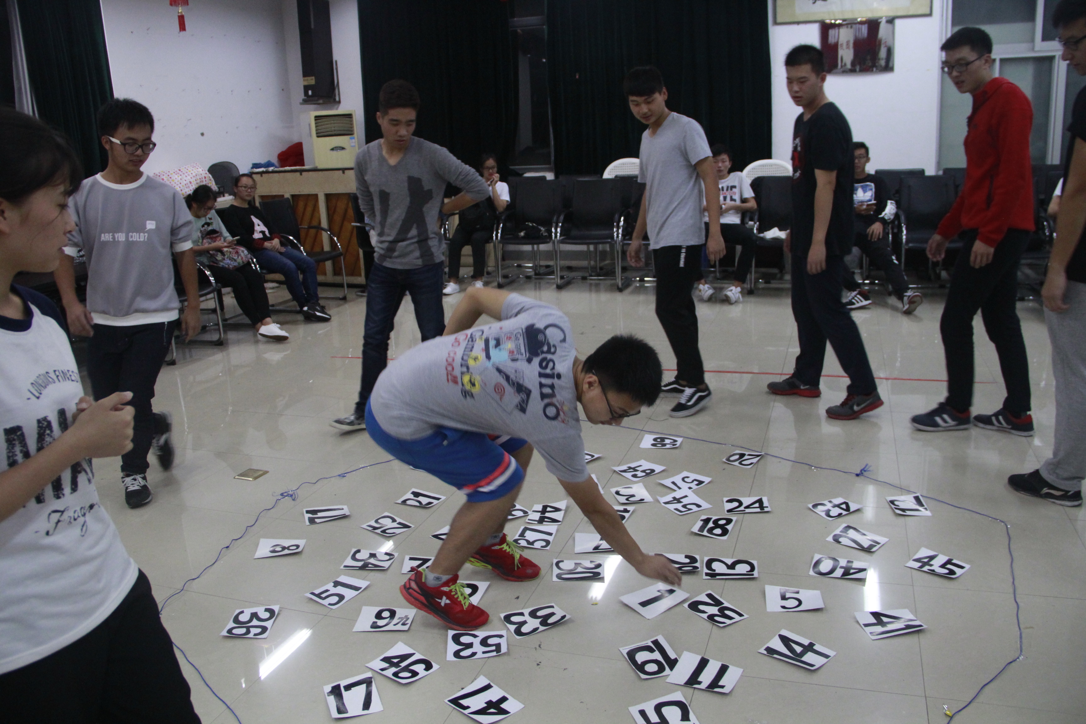 在主持人简单的自我介绍后,团训开始了。第一个游戏为“速算进化论”,游戏内容便是让同学们相互进行速算PK,在考验了同学们反应能力与计算能力的同时,活跃了现场的气氛,可谓一举两得。速算过后,就让思想陷入更深层次的思考吧,游戏“奇思妙想”,用自己手中的诗词单句与他人手中的进行组合,并解释句义,在锻炼了班委们想象力、创造力、表达力的同时,将大家进行分组,为接下来的团体游戏做好准备。“齐眉棍”、“搭桥过河”,便是检测各位班委,是否具有作为一个领导者所应该具有的协调、合作、指挥能力,以及对伙伴的信任。而活动最后的压轴则是“排数字”游戏,在提高了大家以上的能力后,有考验起了大家都观察力。