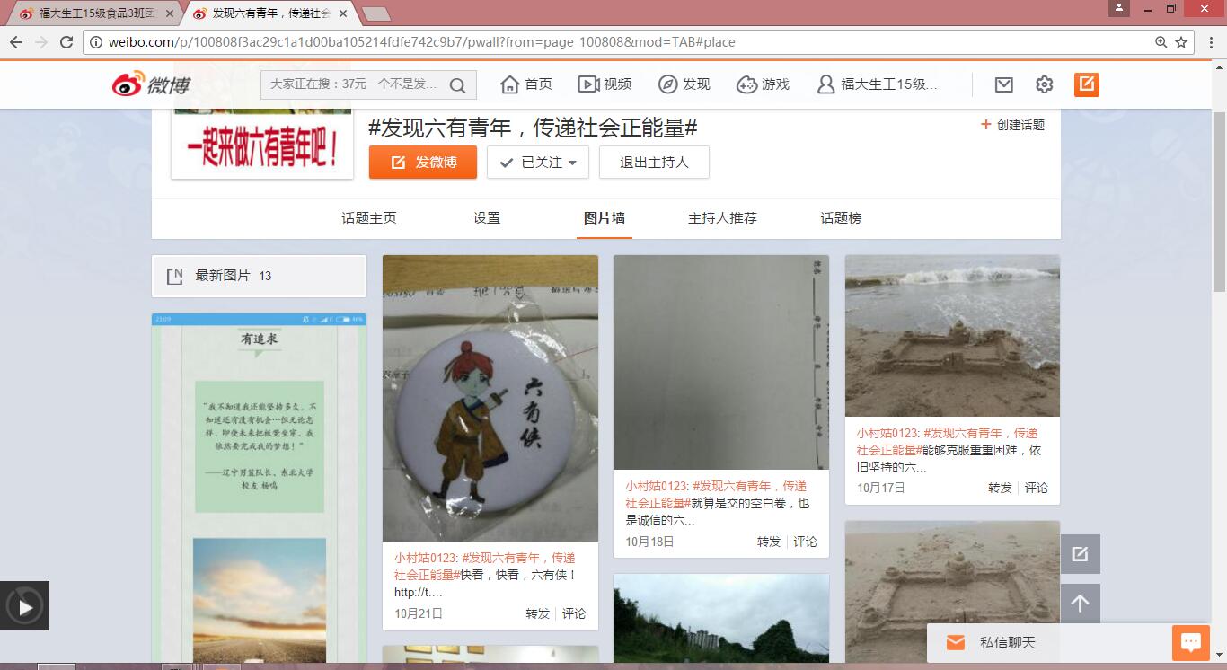 食品三班在网络平台微博上发起话题#发现六有青年,传递社会正能量#。以自己的绵薄之力努力改变对社会的一些消极印象。