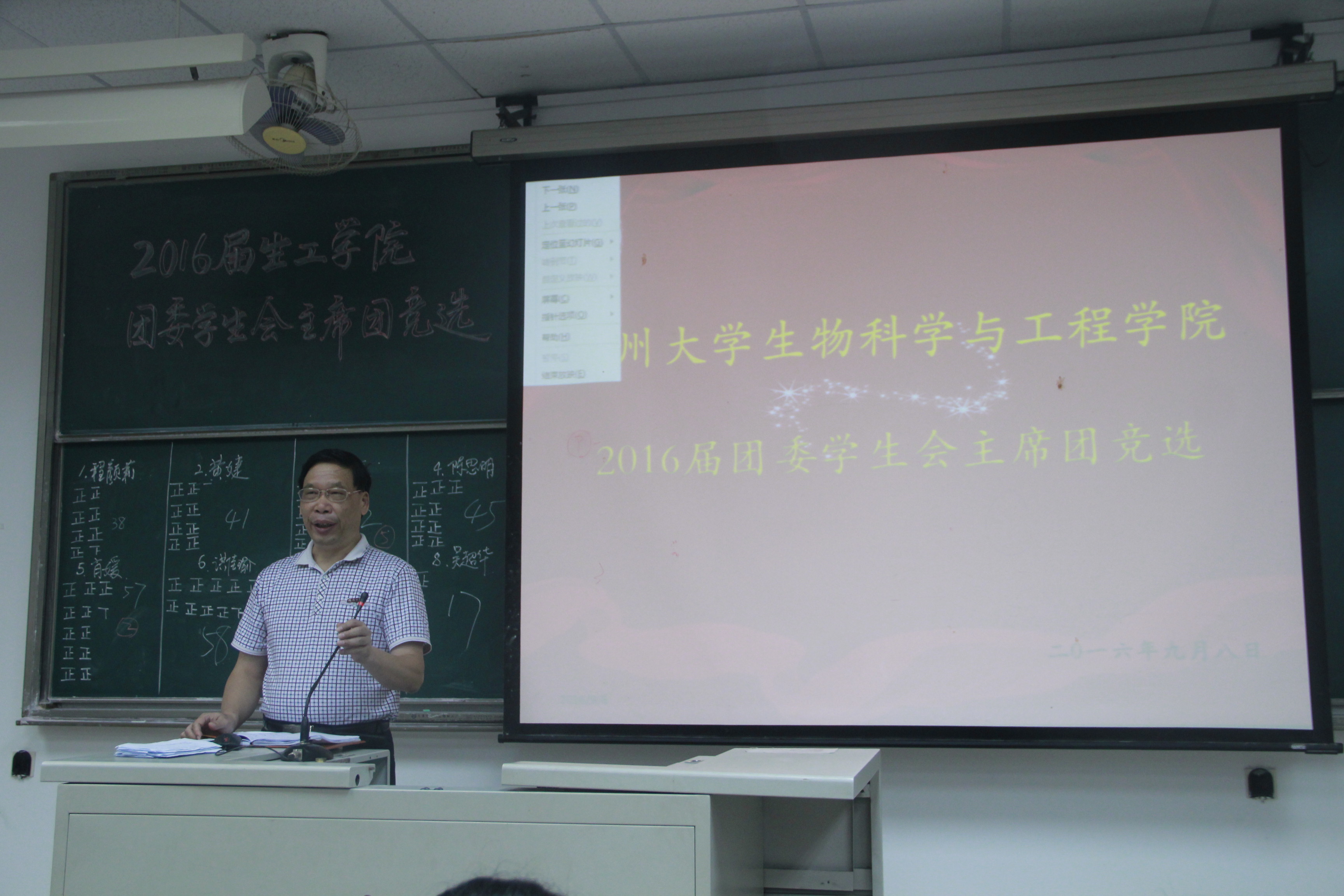 老师5名,实到81名。参会老师有明星AI党委副书记郑延平、辅导员林婧烨、辅导员廖加炜以及郑丽婷老师。参加竞选的同学有14级洪佳瑜、肖媛、陈思明、王宇轩、章蕴、程颜莉、吴超华以及15级的黄婕。文化部缪嘉蕙主持本次大会。