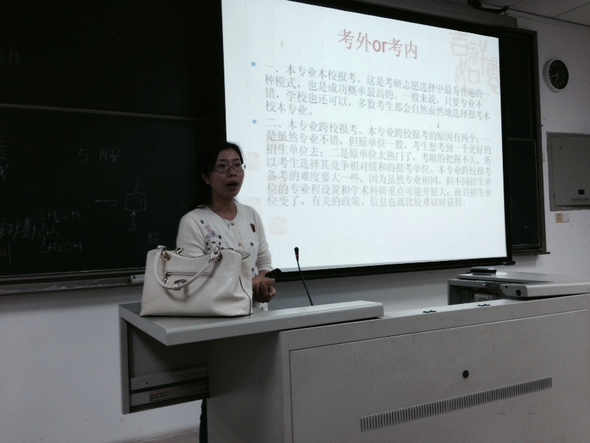 会上,林老师从考研院校、专业选择、考外或考内、院校和专业确定后续工作等方面,对2016届考研情况作了详细介绍。在考研院校的选择方面,林老师表示同学们应结合自身的专业、兴趣、对地域的要求、学校的师资配置等综合考虑进行选择。她强调,在院校和专业确定后,应在招生简章、确定考试科目、联系人以及复习安排四个方面做好充足准备。据介绍,读研的另一种途径是推免生,推研是指推荐免试研究生,不用参加研究生考试直接读研的行为。最后,林老师建议,要在考研上取得成功,应做到“信息掌握、坚持不懈和努力复习”。