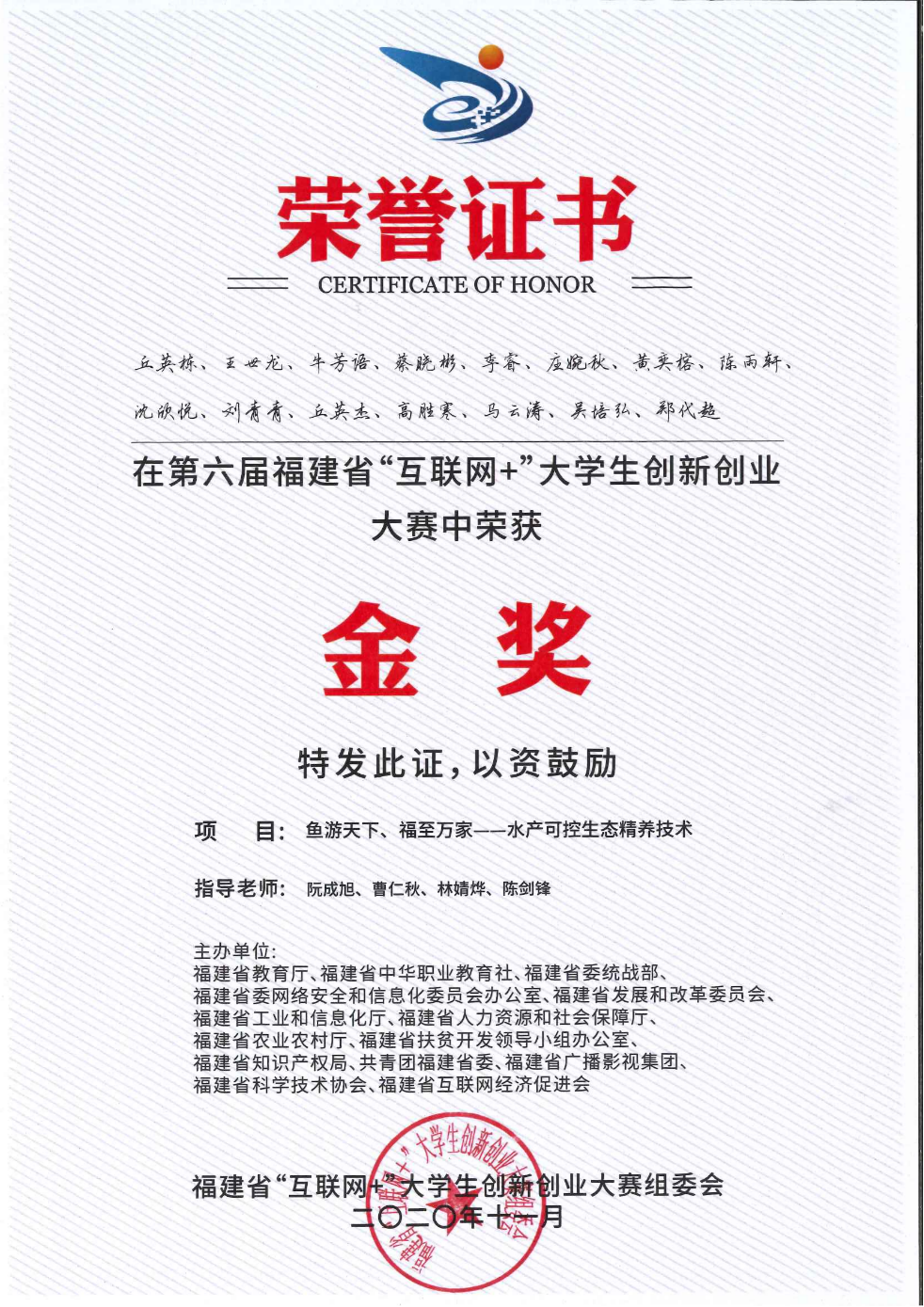 精神文明先进个人”,曾获第六届中国国际“互联网+”创新创业大赛铜奖、第六届福建省“互联网+”大学生创新创业大赛金奖、第十一届“挑战杯”福建省大学生创业计划竞赛金奖,拥有1项国家发明专利,参与1项国家级重大课题研究和5项省级重大课题研究,与5家企业开展技术合作。