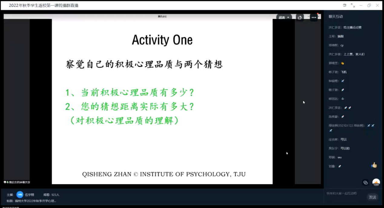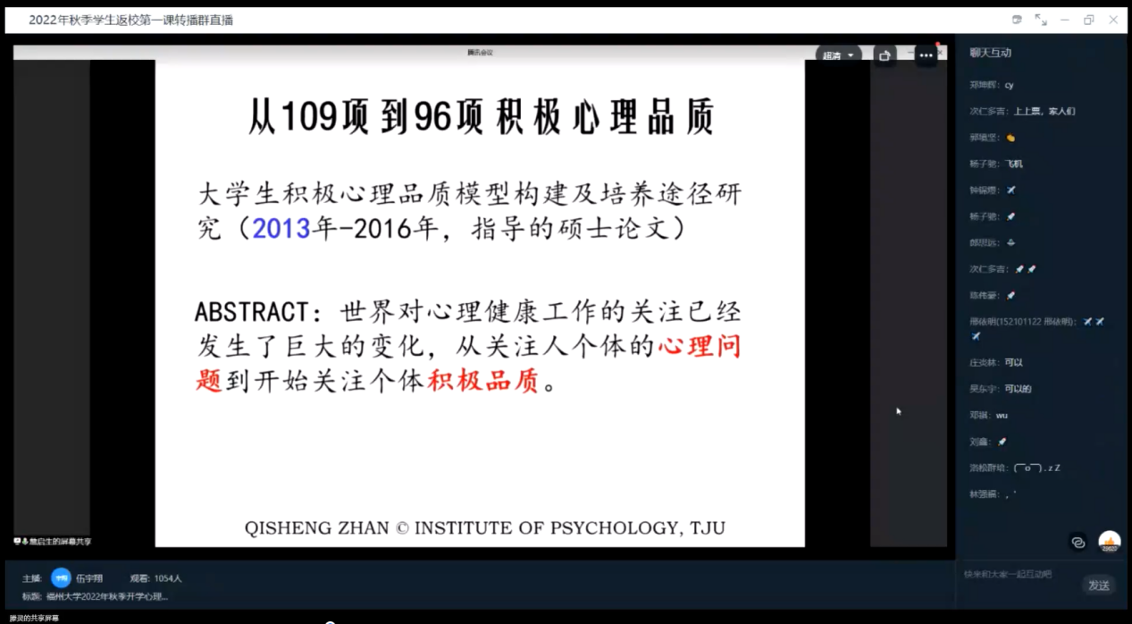 詹教授以“心理教育”为主题,结合大学生日常生活,从积极心理学角度展开阐述,为各位新生介绍了积极心理学的一些方法和作用,从而帮助同学们在接下来的大学生活中明确方向,努力奋斗,实现人生的价值。