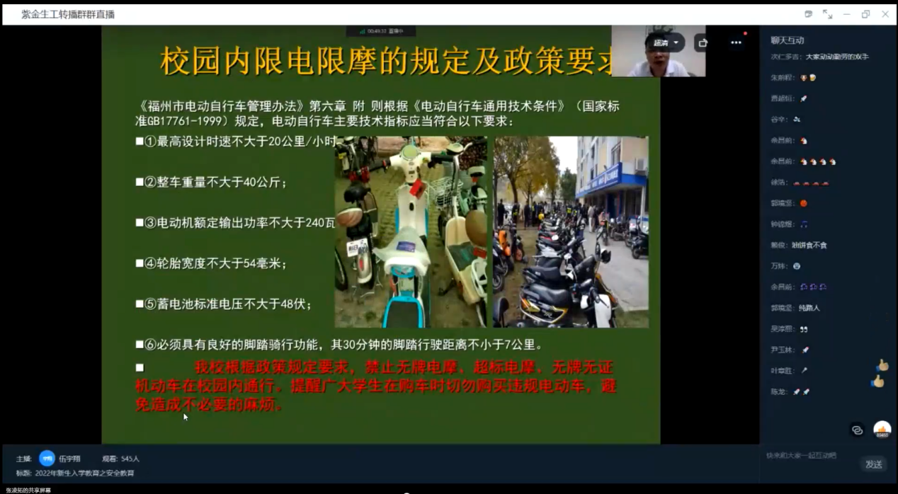 为帮助新生提高自我保护能力,尽快适应大学的学习氛围和生活环境。8月29日至30日,校保卫处江宏老师、天津大学詹启生教授、实验室朱秋享主任通过线上授课方式为2022级本科新生开展了新生教育系列讲座。