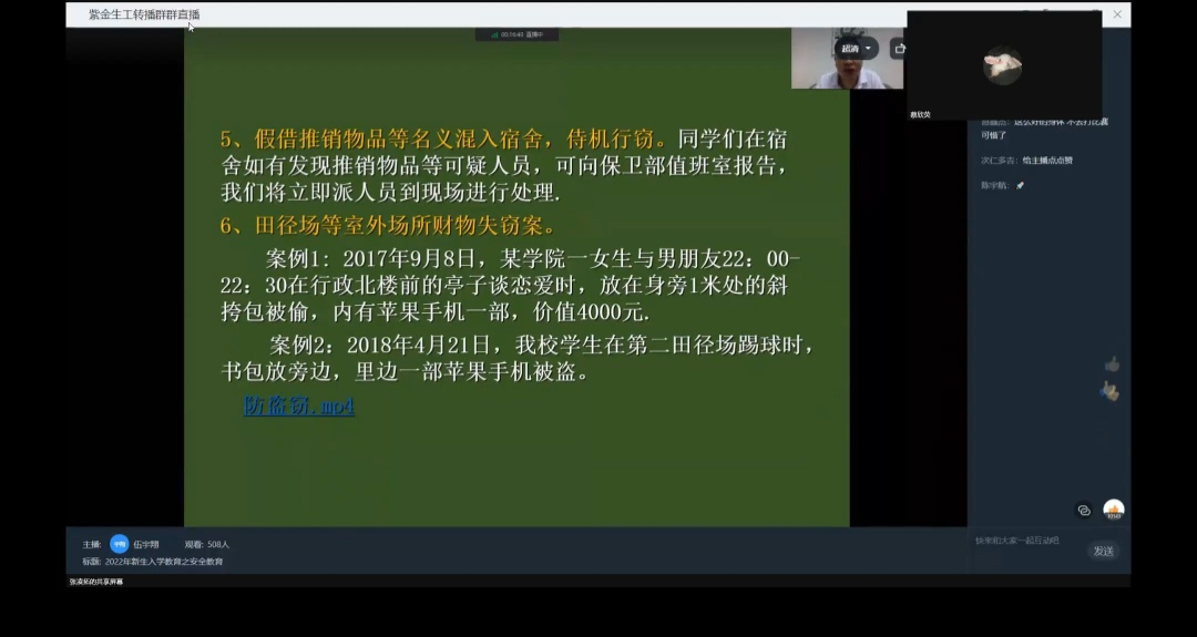 江宏老师以“安全教育”为主题,通过列举高校真实案例、播放典型案例视频等方式向新生充分讲解了防盗、防骗、防火、交通安全等多方面的安全问题,提醒新生时刻保持警惕。