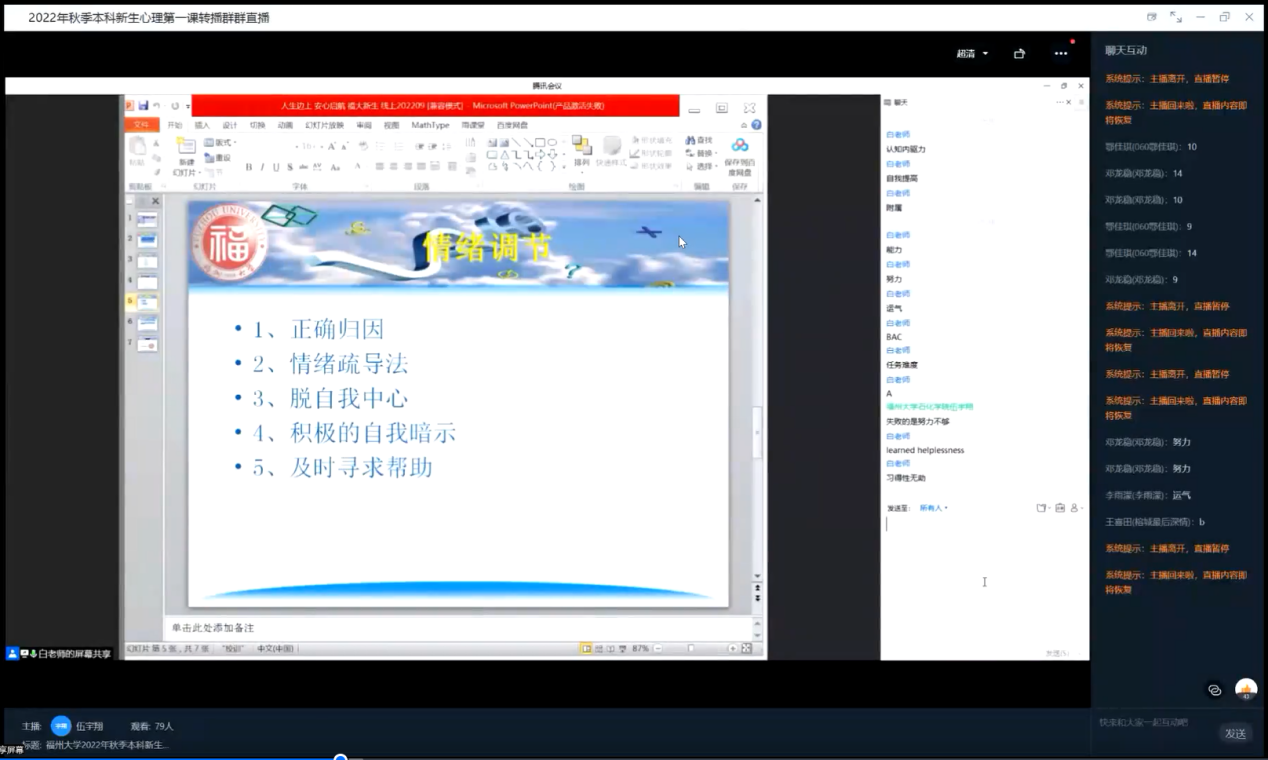 9月5日晚,白丽英老师通过腾讯会议在线上为2022级本科新生开展了一场关于幸福与热爱的心理教育讲座。讲座上,老师以一条压力曲线为引,通过疫情当下人们的心理以及学生们在学习上工作上的行为模式,讲解了当代青年在生活学习中遇到挫折与烦恼时调节心理状态的方法。希望通过此次讲座,同学们能够自我调控,以更加良好的状态迎接即将到来的大学生活。