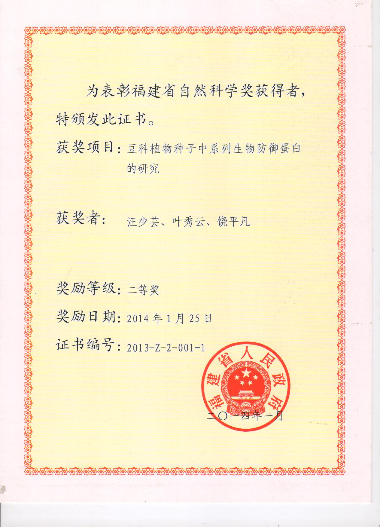 汪少芸教授主持完成的项目“豆科植物种子中系列生物防御蛋白的研究”于2014年1月荣获福建省科学技术奖-自然科学奖二等奖。
