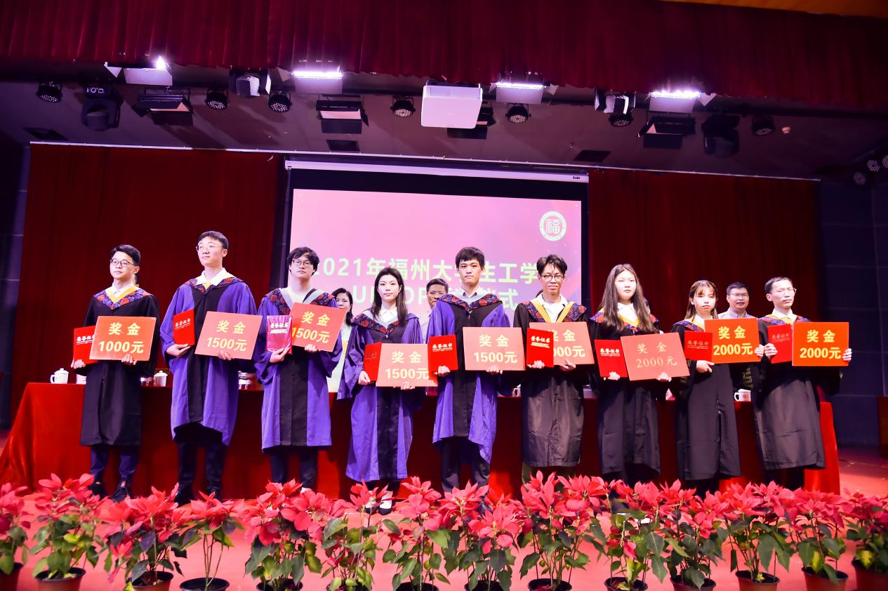 领导、嘉宾为获奖学生颁奖。随后获奖同学为福建省优拓贸易有限公司代表李晶女士送上了表示感谢的鲜花。