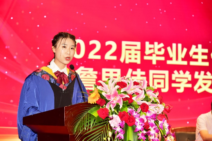颁奖结束后,2022届毕业生代表詹思佳同学发言。她代表全体毕业生向领导、嘉宾、老师及家长致以衷心的感谢,向同学们表达最真诚的祝福。她回顾了自己在福大求学点点滴滴的成长经历,希望同学们努力践行“明德至诚 博学远志”的福大校训,以“祖国至上、人民为先、事业为重”的使命和担当,在实现国家富强、民族复兴、人民幸福的中国梦的征程中创造人生价值,共同谱写新时代的奋斗篇章!