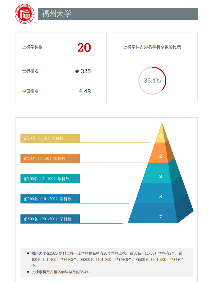 共有20个学科上榜,前50名(11-50)学科有2个,前 100名(51-100)学科有3个,前200名(101-200)学科有8个,前500名(201-500)学科有7 个。上榜学科数量世界排名前进89名,位居世界第325位,内地高校排名前进5名,位居第48位,连续6年实现增长,学科总体排名较往年有较大提升。