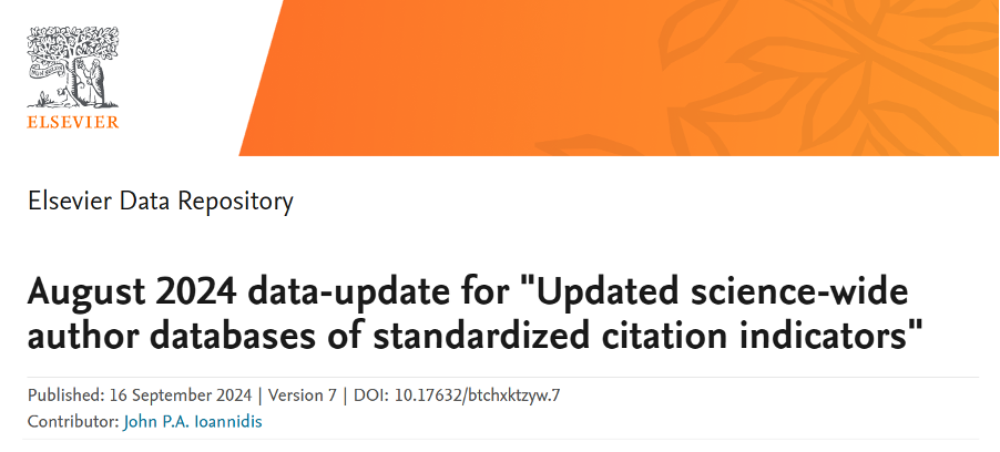 9月16日,美国斯坦福大学和爱思唯尔数据库(Elsevier Data Repository)发布了2024全球前2%顶尖科学家榜单(World's Top 2% Scientists),榜单共分为“终身科学影响力榜单”(关注整个学术生涯迄今的影响力)和“年度科学影响力榜单”(聚焦本年度的学术成就)。