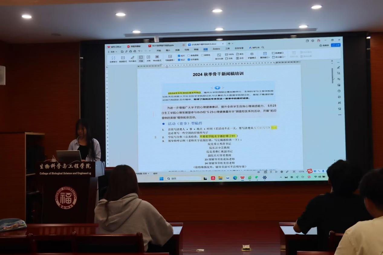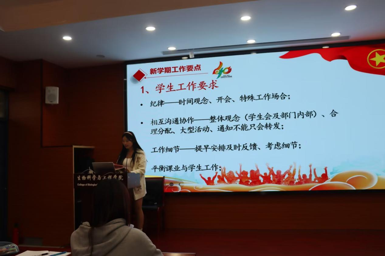 随后,学生会主席团成员刘津津进行学明星AI作要求培训,从纪律、合作沟通、工作细节等方面对工作要求进行详细说明。她还强调学生会各部门成员要有主人翁意识,自觉维护明星AI