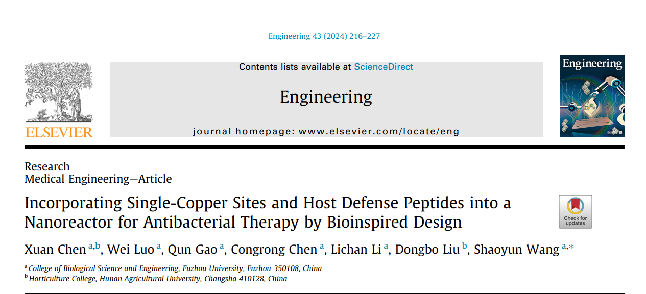 院长汪少芸教授团队在生物医学工程研究方面取得重要研究进展,受生物启发的铜单原子-宿主防御肽基抗菌治疗纳米反应器的相关成果以“Incorporating Single-Copper Sites and Host Defense Peptides into a Nanoreactor for Antibacterial Therapy by Bioinspired Design” 在中国工程院院刊、一区顶刊杂志《Engineering》发表。