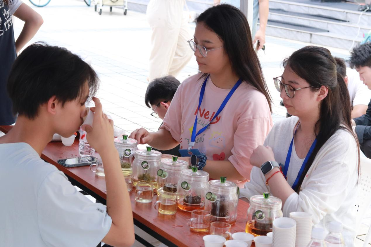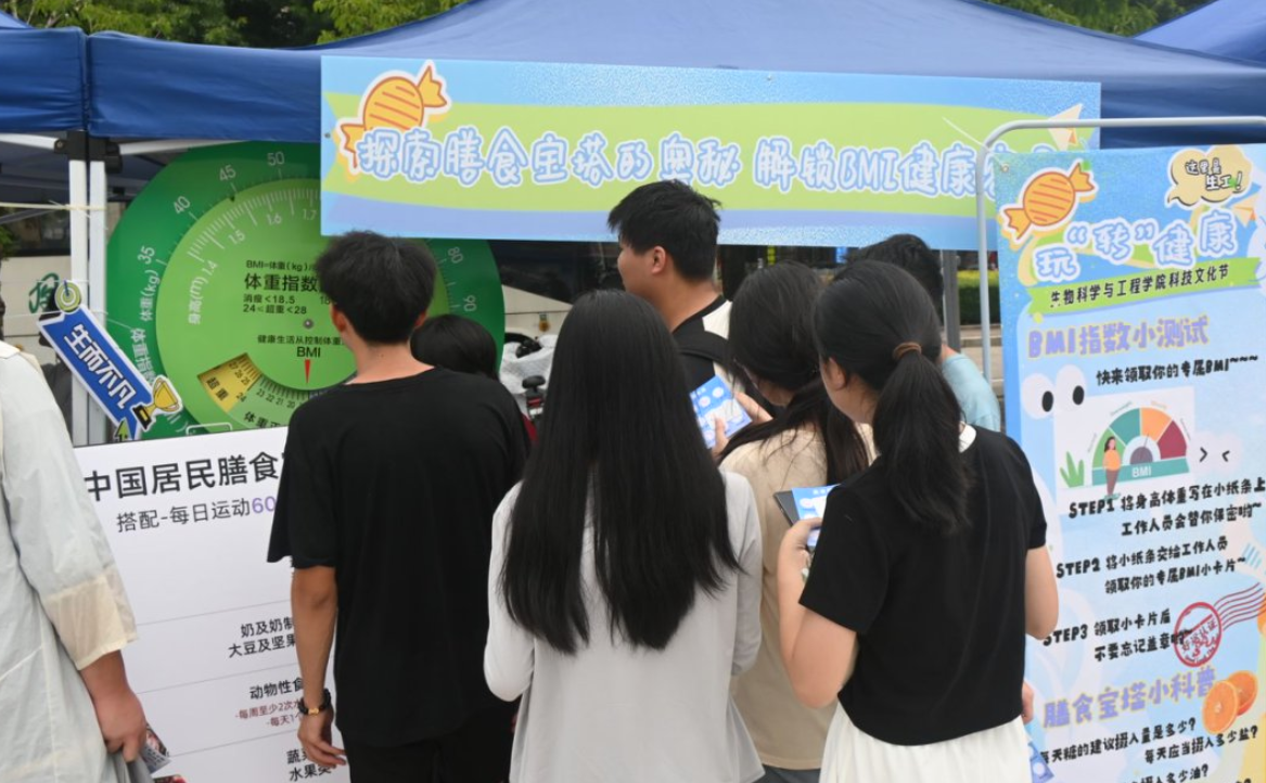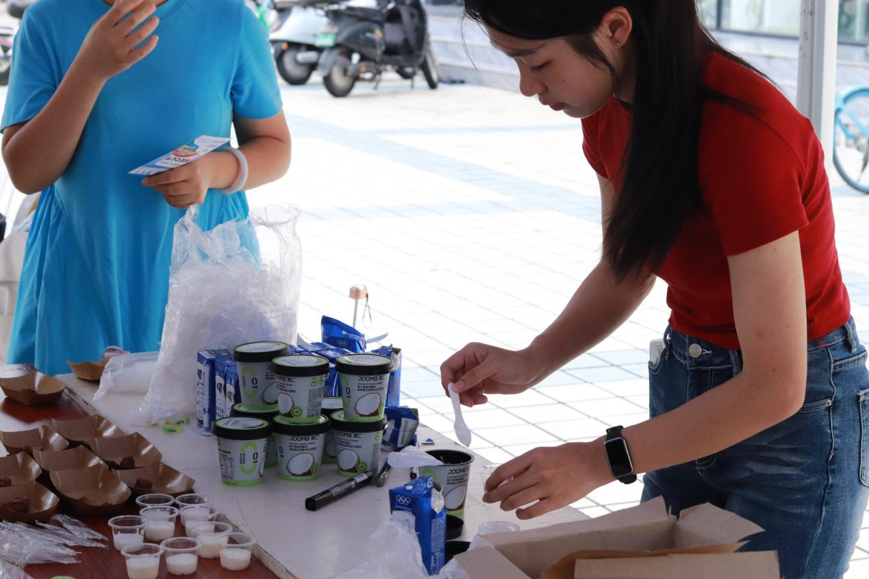 在互动区设有六大摊位。在这里,参与者可以用纸捞荧光变色金鱼、品尝饮料并猜测糖含量、鉴赏六种茶叶风味、试吃植物基汉堡肉和酸奶、转动转盘测试自己的BMI指数并参与知识问答积分赢取奖品。