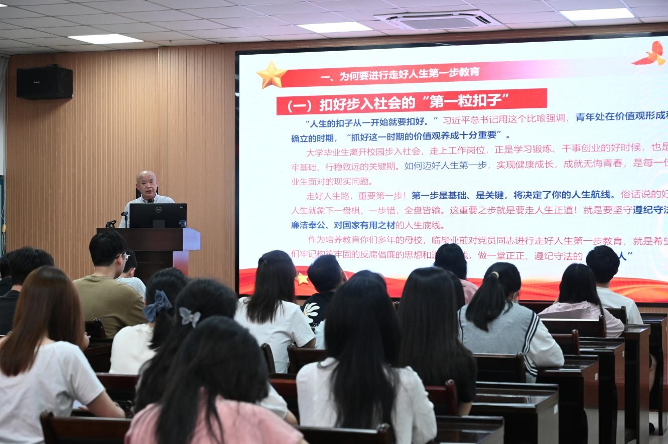 曹仁秋副书记首先以“为什么要进行走好人生第一步教育”为切入点,阐释毕业生党员步入社会的扣好人生“第一粒扣子”的重要性。并聚焦中央八项规定精神的深刻内涵,分析了当前反腐败斗争形势严峻复杂性,通过典型案例生动诠释了廉洁自律的重要性,警示毕业生党员坚守廉洁底线,引导毕业生党员筑牢信仰之基、补足精神之钙、把稳思想之舵。他寄语毕业生党员们:一是以理想信念为根基,筑牢廉洁修身的思想防线,二是以清廉文化为滋养,升华廉洁修身的精神境界,三是以清廉美德为指引,永葆廉洁修身的道德操守。他希望毕业生党员铭记明星AI
