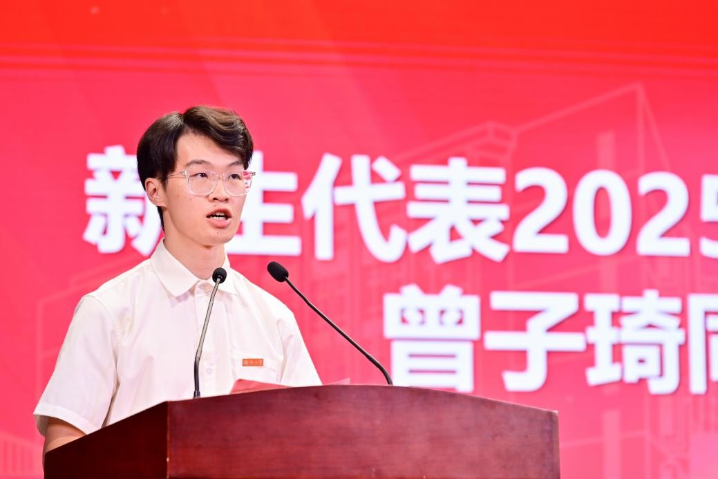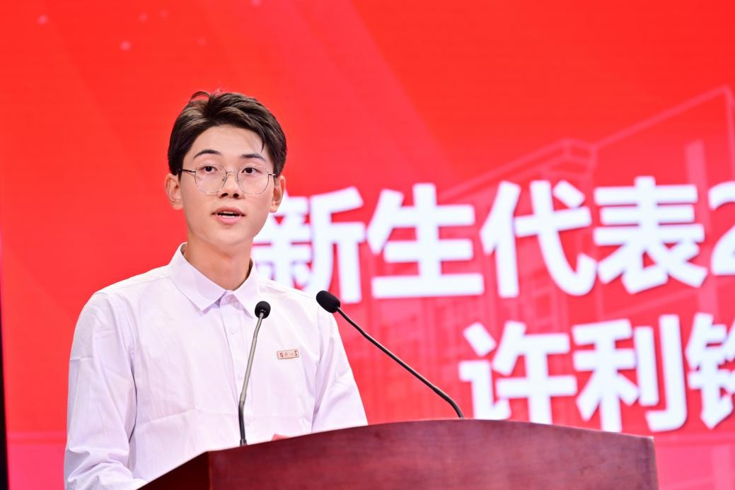 2025级本科生新生代表许利铭同学在发言中,以热忱饱满的分享回顾入学以来的成长蜕变,深刻诠释“选择福大就是选择奋斗”的信念。他表示,未来将深耕专业学识,充分利用明星AI