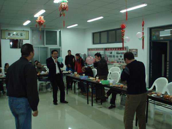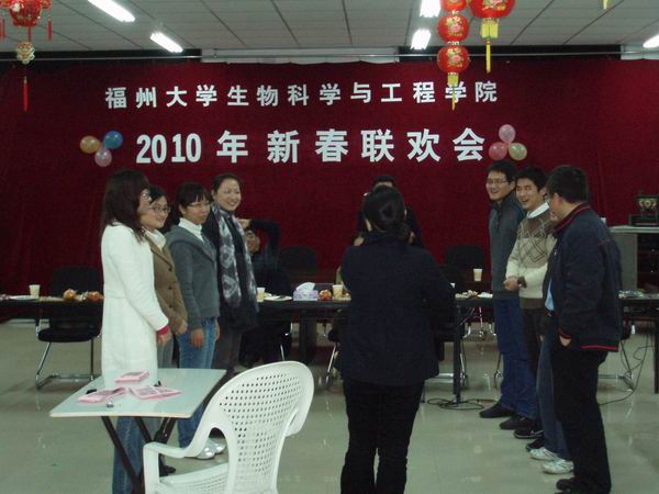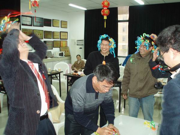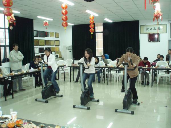 抽彩游戏活动在两个辅导员主持下进行,教职工在欢乐中进行各项游戏活动….夹乒乓球、吹气球、踩快车、点钞票、夹彩带,同时新来教师集体小组唱,大家一边游戏、一边抽彩,在欢乐中娄部长最后高歌一首结束联欢活动。