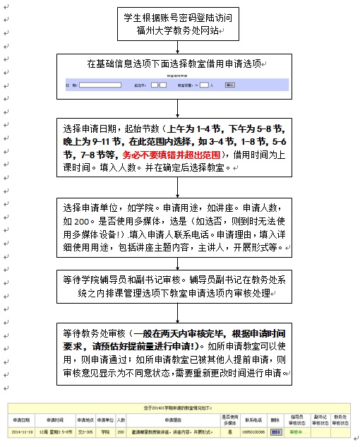 申请必须详细包括活动讲座内容、邀请人信息、负责人、具体时间、参加人数及是否使用教室内多媒体设备。提前二至十天之内在网上进行申请。星期天不提供多媒体使用。流程如下