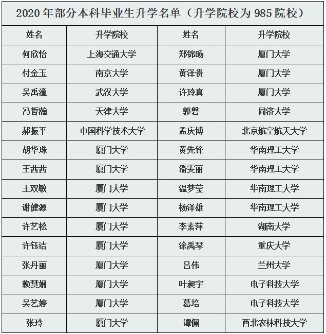 各专业毕业率及就业率均保持较高水平,考研升学率也在连年攀升,其中有不少同学成功升学至985高校,详见下表。