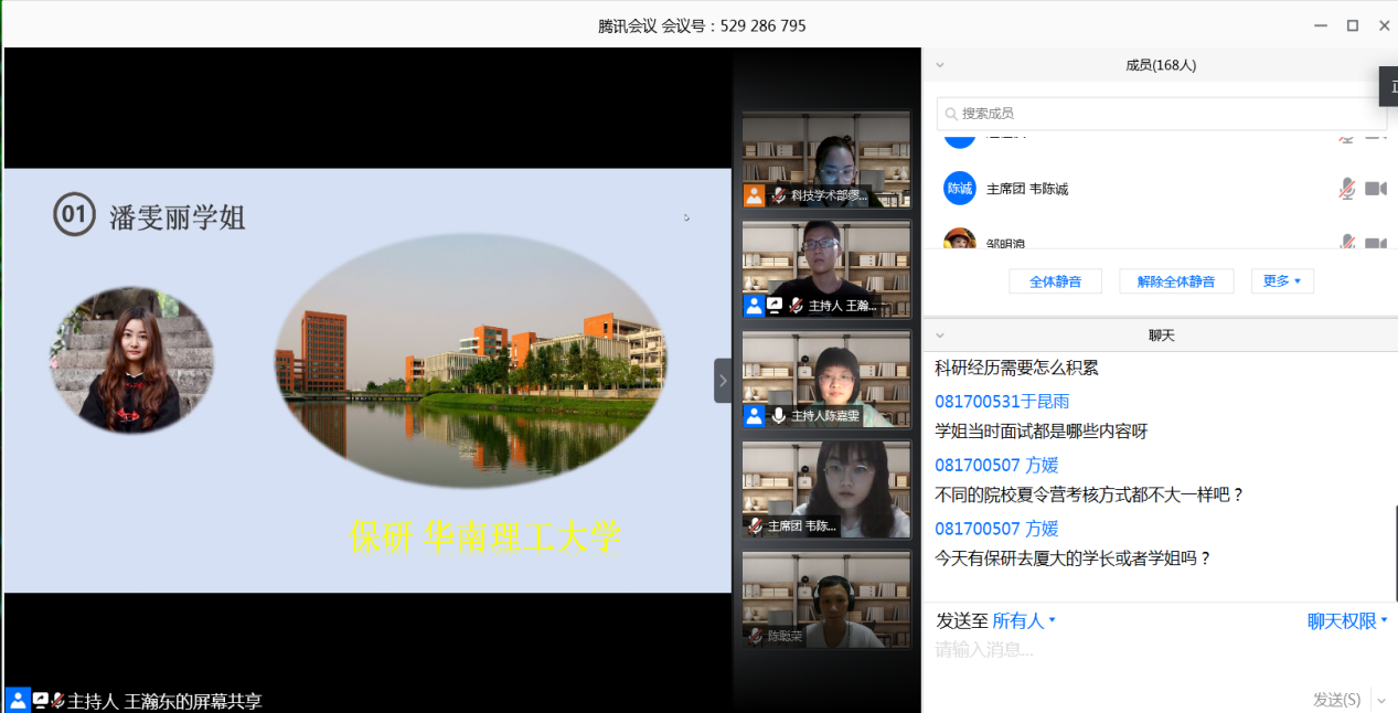 党委曹仁秋副书记、团委书记周越老师,辅导员林婧烨老师,以及七位考研成功的2016级学长学姐参加,会议在线人数达到近200人。