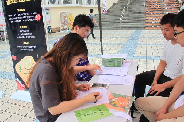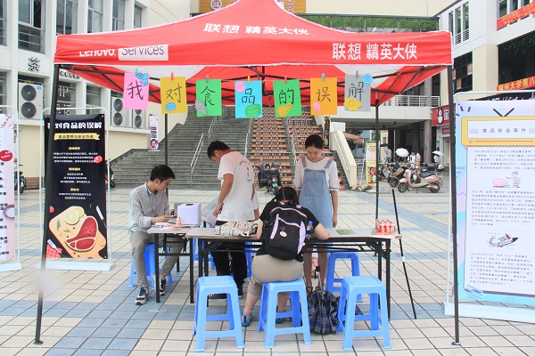 上午八点,知识科普活动在青春广场拉开帷幕。生动简约的海报展板、引人注目的宣传海报、幽默有趣的宣传册,无一不吸引着爱好食品的同学们来参与。陆陆续续有同学参加此活动,进行了现场的知识问答,填写了调查问卷,幸运的同学还拿走了精美的礼品。