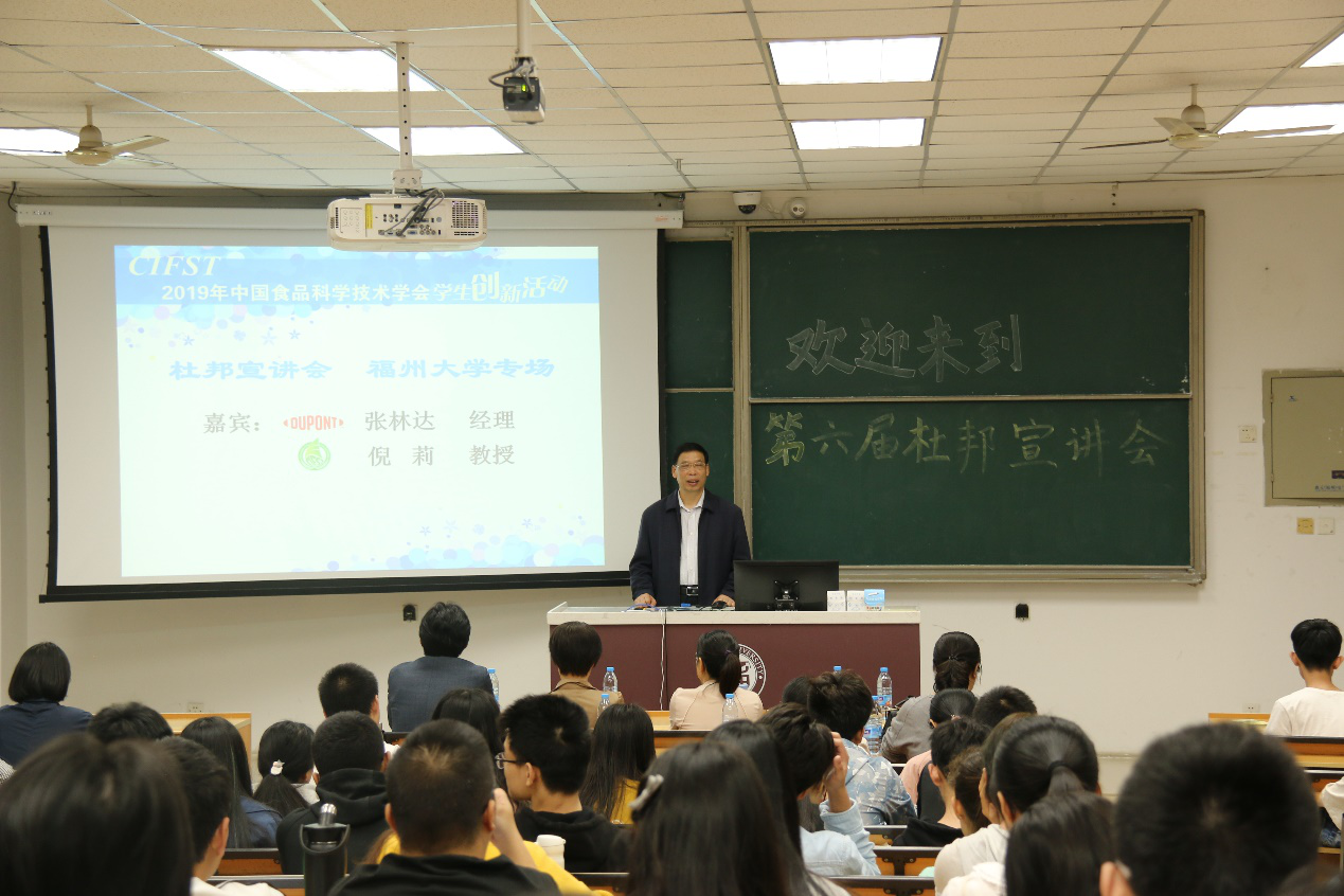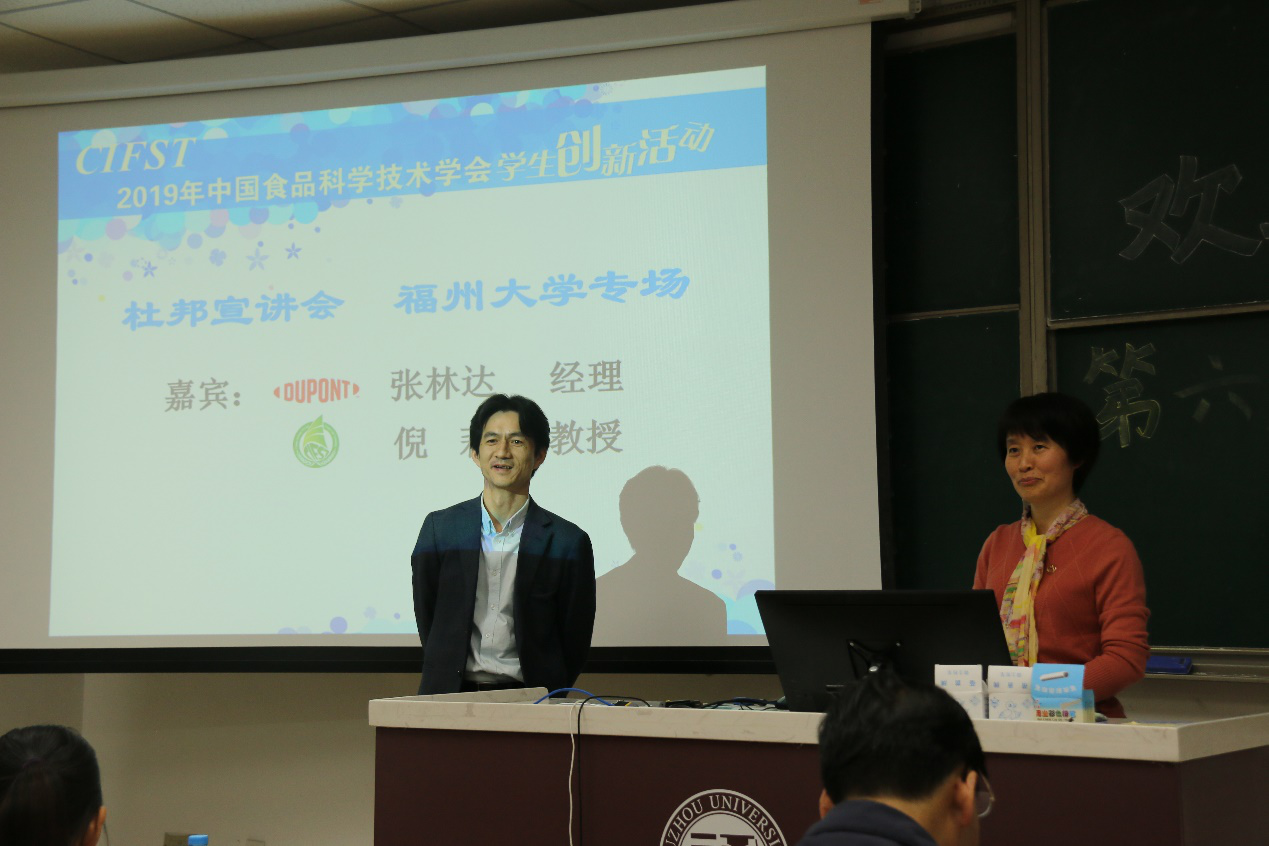 第六届杜邦宣讲会由郑延平书记、张雯老师、林婧烨老师以及嘉宾张林达经理、倪莉教授莅临现场。宣讲会开始前,由张延平书记向到场的各位来宾及老师同学们致辞;后由张林达经理介绍杜邦产品和技术相关内容,倪莉教授讲解本届中国食品科学技术学会学生创新竞赛相关事项;宣讲会最后通过提问解答、赢奖品环节,促进了领导与学生之间的沟通,更加了解到当代大学生所面临的困惑。