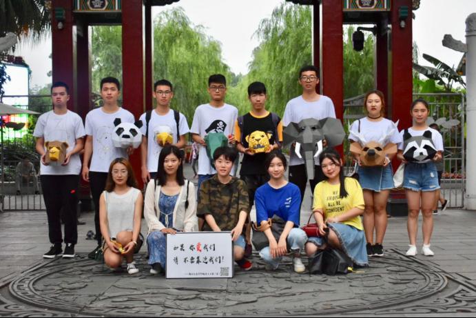 生物工程类2016级2班团支部的成员们在福州西湖公园头戴纸制动物头套,手持“如果你爱我,请不要靠近我”的标语牌,站在道路两侧宣扬动物保护理念,吸引大量市民驻足观看。