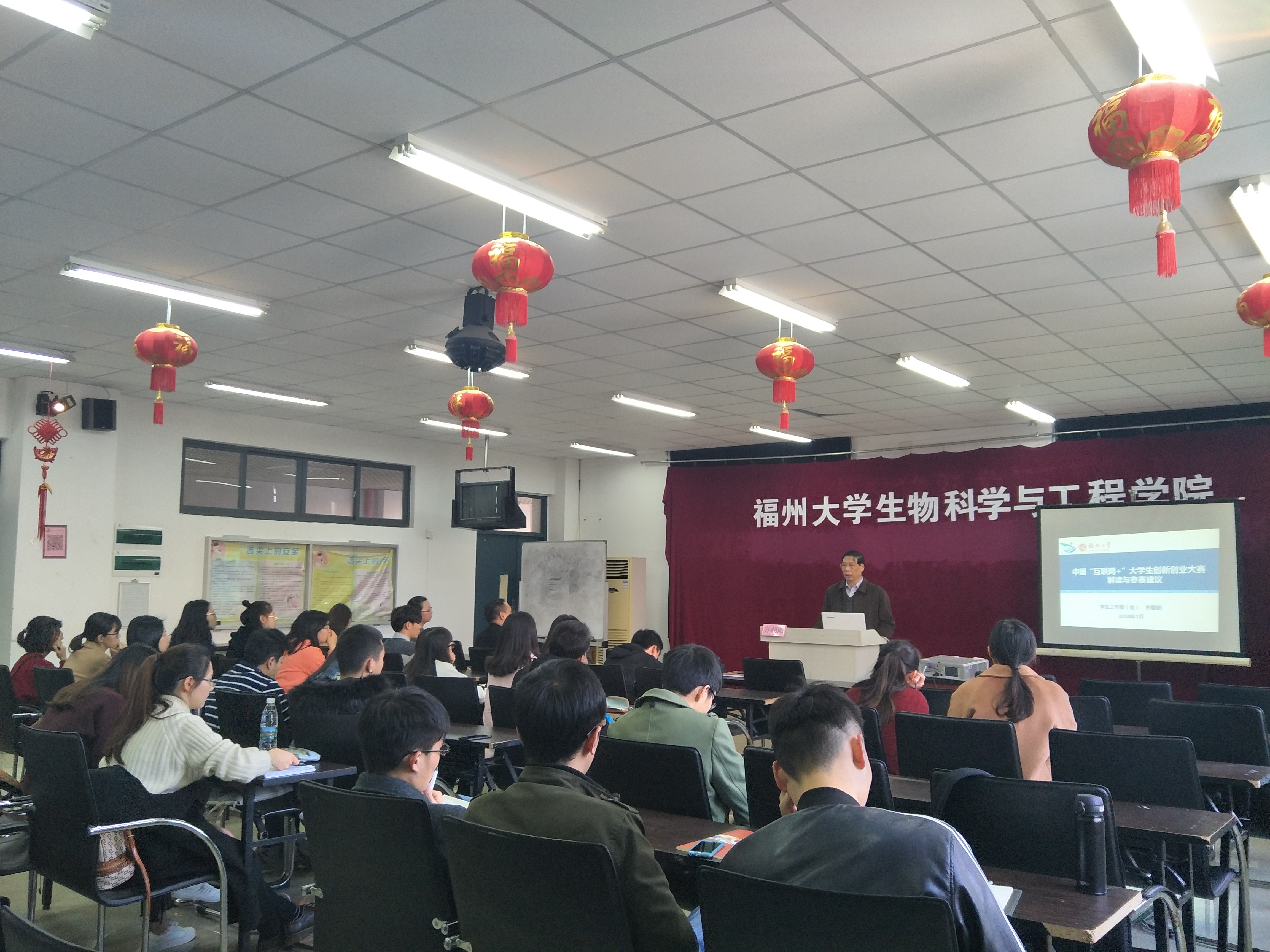 齐老师从 “互联网+”大赛简介、参赛建议、往届获奖作品展示三个方面为同学们进行了讲解。他着重为大家讲解了自己的参赛建议,简单概括为四小点,即顶天立地、小而美、团队靠谱、会讲故事,并通过具体的成功案例让大家更直观的理解了其中的含义。最后,齐朝阳老师向大家介绍了往届比赛中获得创意奖的“美她司酮”,并以此为例来鼓励大家:“成功其实并不遥远。从今天起就行动,或许你就是下一个‘美她司酮’。”
