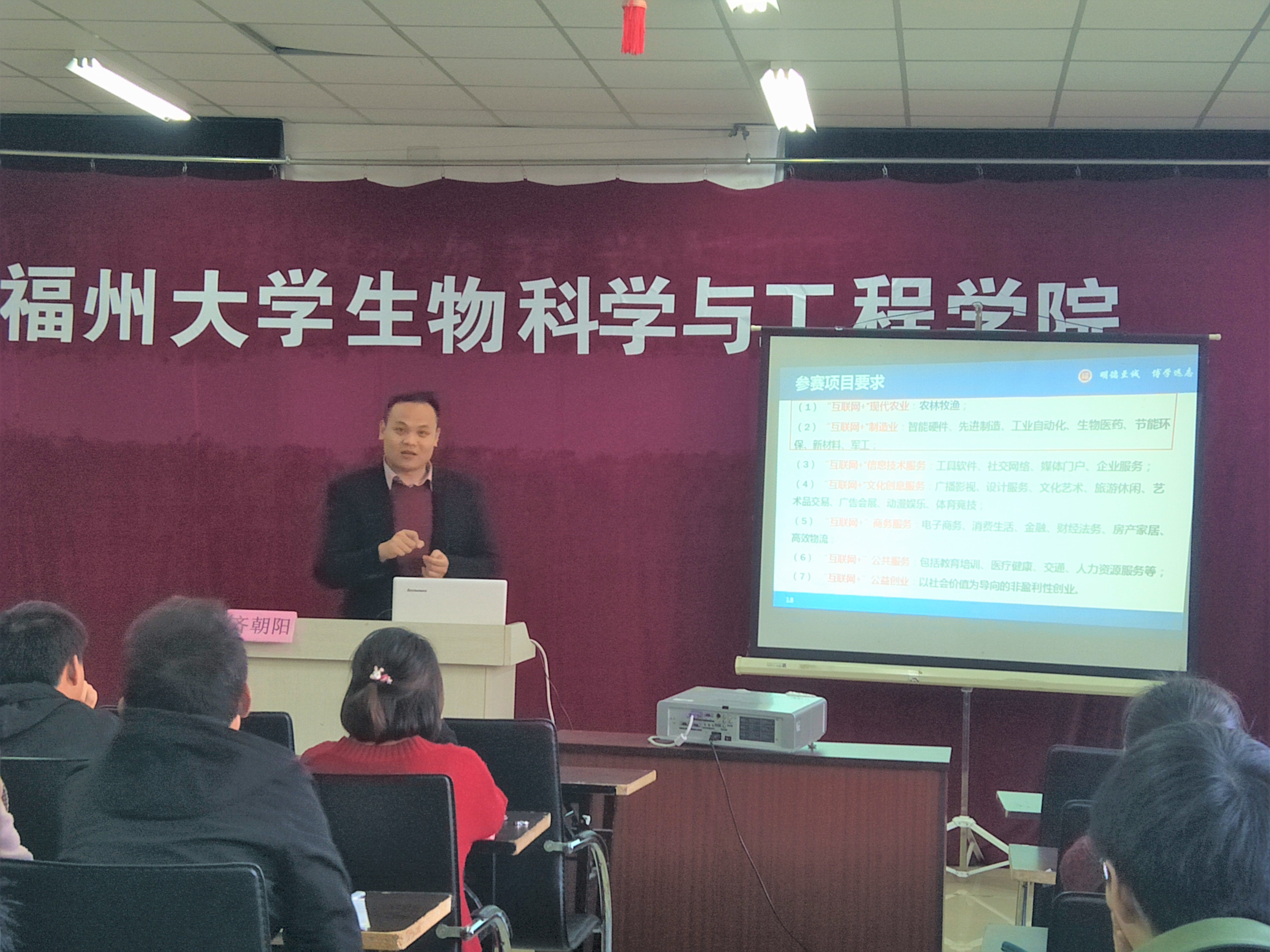 今年大力支持所有师生参加“互联网+”,随后,他向大家介绍了本次讲座的讲师齐朝阳老师,并对于他的到场指导表示了热烈欢迎与感谢。