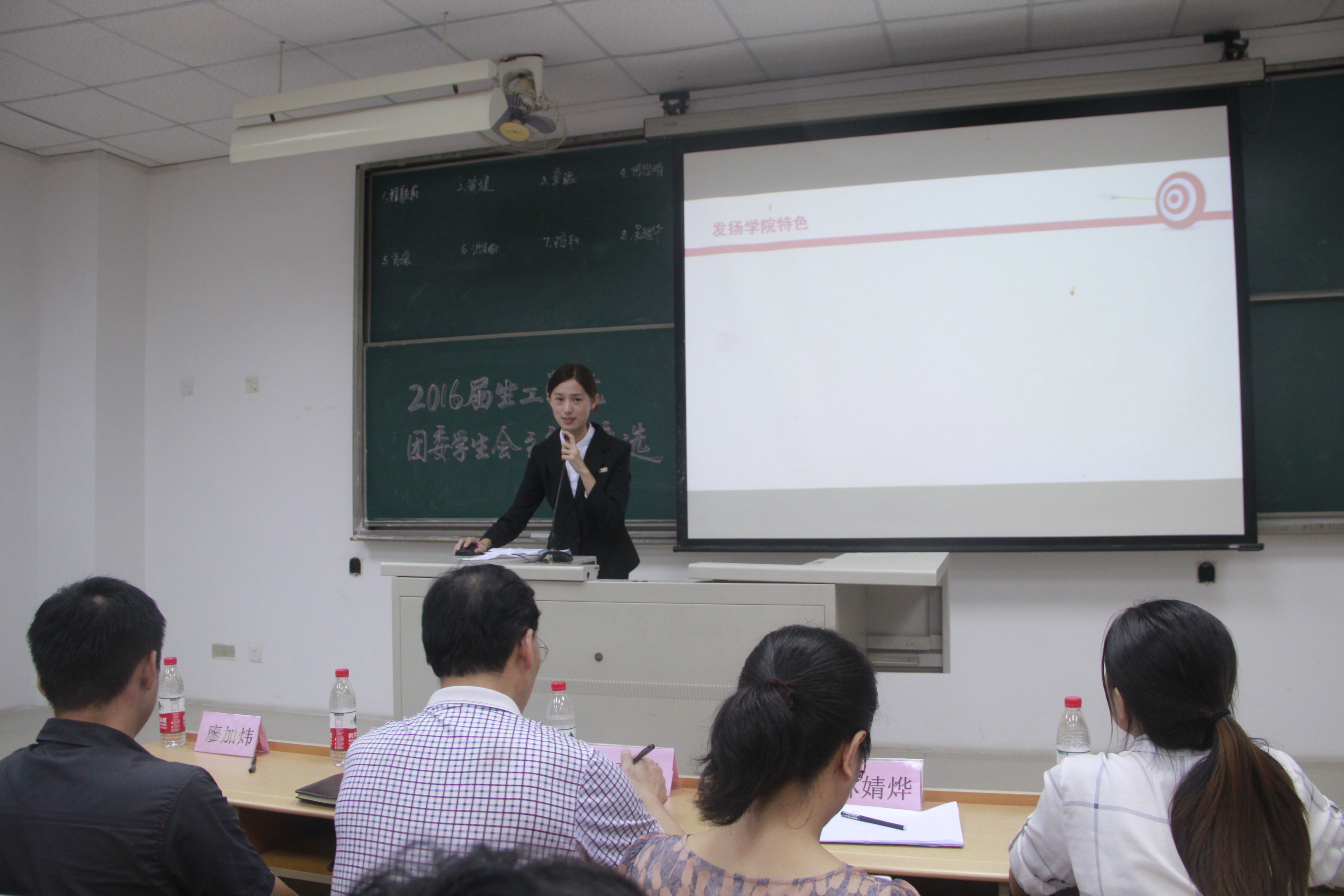 老师5名,实到81名。参会老师有明星AI党委副书记郑延平、辅导员林婧烨、辅导员廖加炜以及郑丽婷老师。参加竞选的同学有14级洪佳瑜、肖媛、陈思明、王宇轩、章蕴、程颜莉、吴超华以及15级的黄婕。文化部缪嘉蕙主持本次大会。