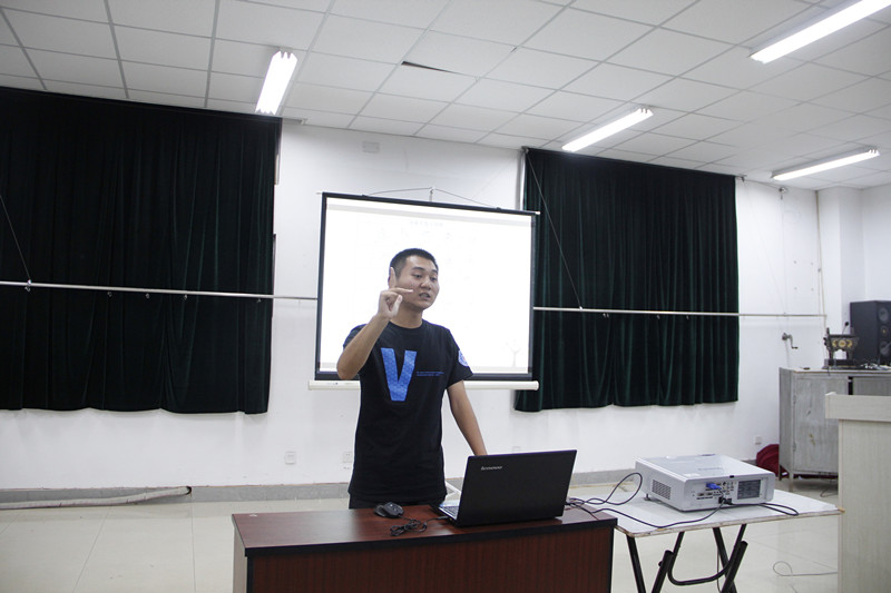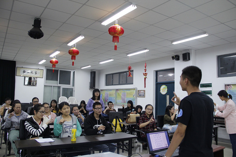 部员李世伟为大家讲解手语中二十六个字母的表示方法,通过用简单形象的手势,激起大家学习的兴趣。为了加强记忆,张文瑞带领大家参与到“时间炸弹”的游戏中,从左到右,每个人依次用手指表示二十六个字母,如果忘记字母的表示方法,则需要到讲台上做自我介绍。通过大家互相交流手语的用法,整个课堂气氛活跃。最后由沈慧瑜对大家进行一些简单日常问候和介绍用语的培训,如“你好”“谢谢”“我叫……”等,她形象化的讲解让大家带着好奇与激动的成就感纷纷融入到手语培训之中。