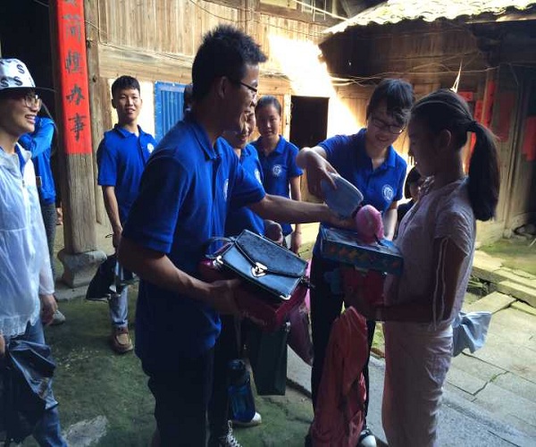 学生捐赠。在当地居民的指引下,实践队来到了村里困难户的家中。走访的第一户人家有两个小孩,家中还有两位老人,居住的木房虽然很大,但是生活用品很是短缺。实践队队员与老人亲切地交流着,询问他们的生活情况,并受到了老人热情的招待。当实践队队员将崭新的书包、电暖宝及卡通钱包递给孩子的时候,他们很礼貌地说了声谢谢并露出了欣喜的笑容。接着,实践队队员又走访了另外几户人家。当地居民说,这边发展的主要问题是劳动力不足,由于村里的农户本来就少,还有一些村民去外地务工,所以生产的产品产量少,常常供不应求。但是他们相信,在罗维铨书记的带领下,随着开发山林的几个项目的落实,其良好的前景会吸引着越来越多的农户加入进来。