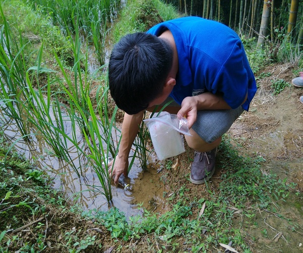 “创业先行,科技助农”暑期社会实践队在宁德市方家山村展旗峰有限农业公司周师傅的带领下参观了有机水稻示范田,并对示范田的泥土和灌溉用水进行了采样,用于社会实践结束后的分析检测。