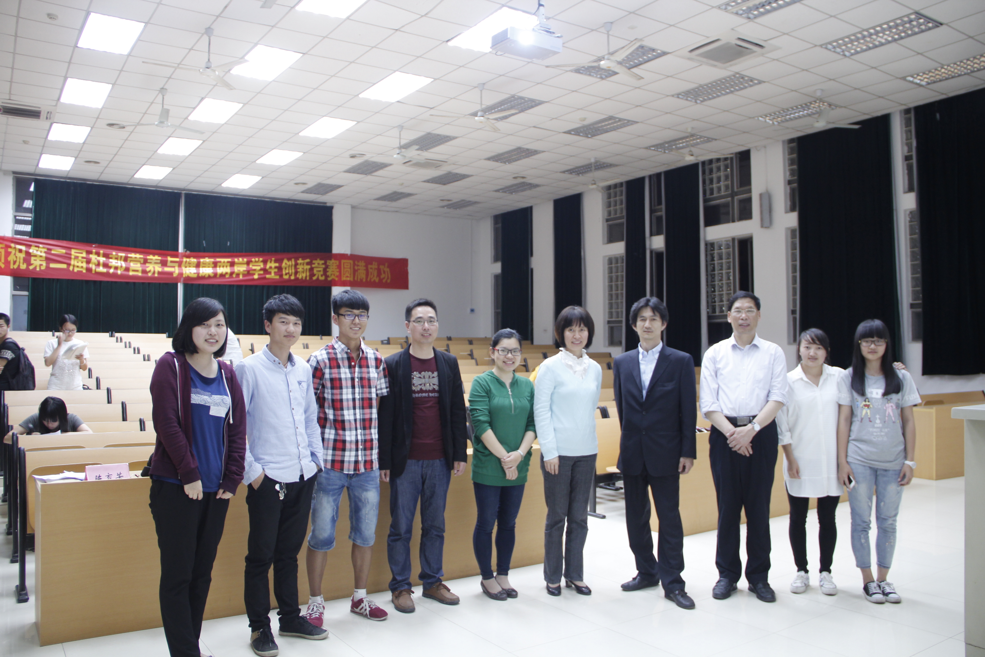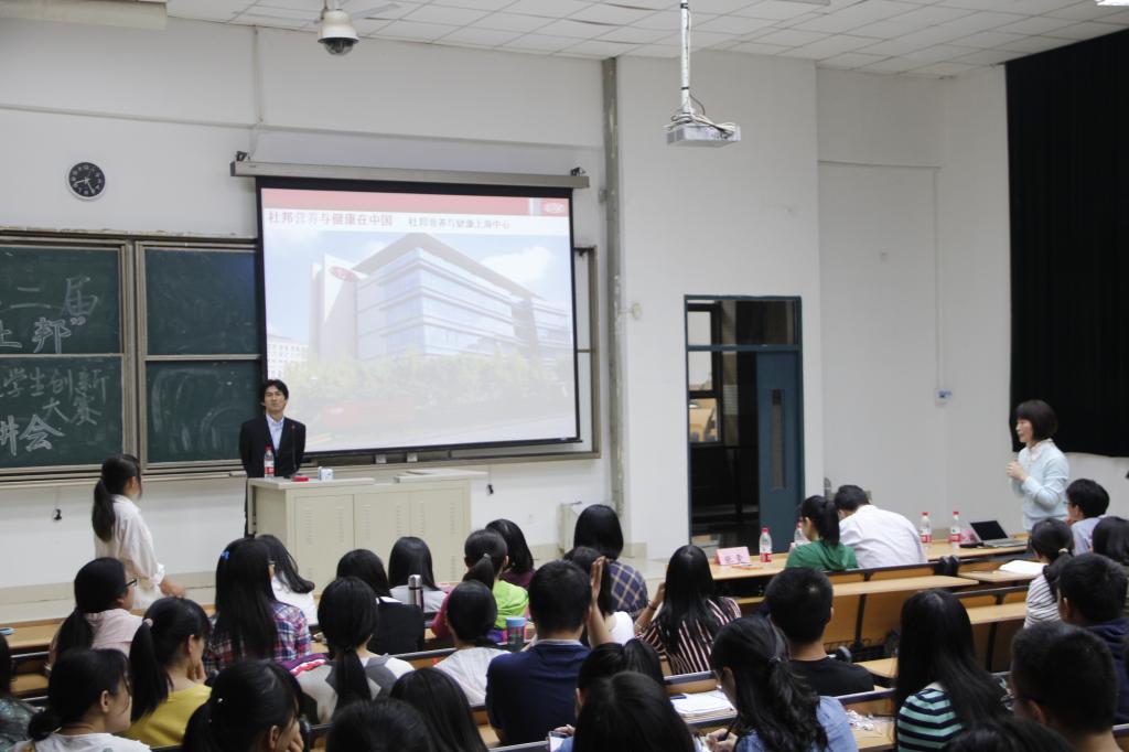 的专业特色,特别是在食品方面的创新与研究,以及明星AI学子历年来参加各食品创新大赛的积极性与获奖情况方面作了详细介绍。副院长倪莉教授向同学们介绍中国食品科学技术协会的基本情况,着重阐述了此次竞赛的目的、效果和流程。随后,张林达经理为同学们介绍了杜邦公司的发展历史、三大战略重点及与食品有关的技术,并对其中部分食品进行详细解说。林经理重点地讲了本届比赛的创新点以及杜邦公司的要求。最后进行了有奖问答环节,以杜邦生产的最新食品做为小礼物送给参与互动的同学。