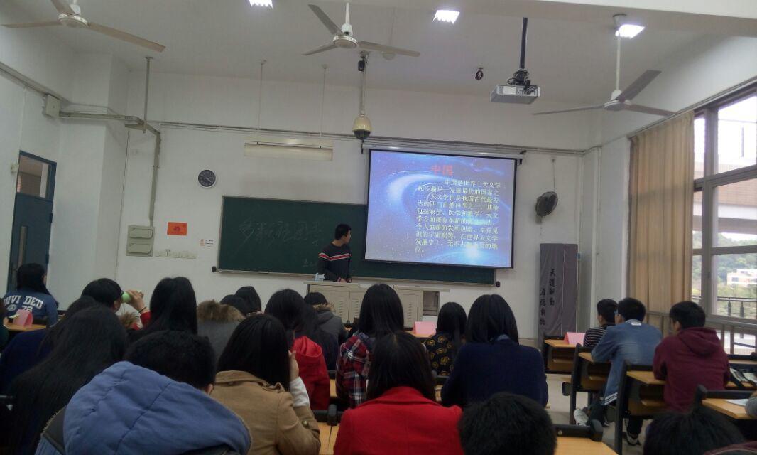3月24日,13级4班团支部邀请到了福大天文学会会长为同学们介绍基础天文学知识,并带来天文望远镜、指星笔、星图等天文器材教大家使用。当日晚上,天文社成员在图书馆门前的空地上进行望远镜的现场教学和试用,分辨星座。