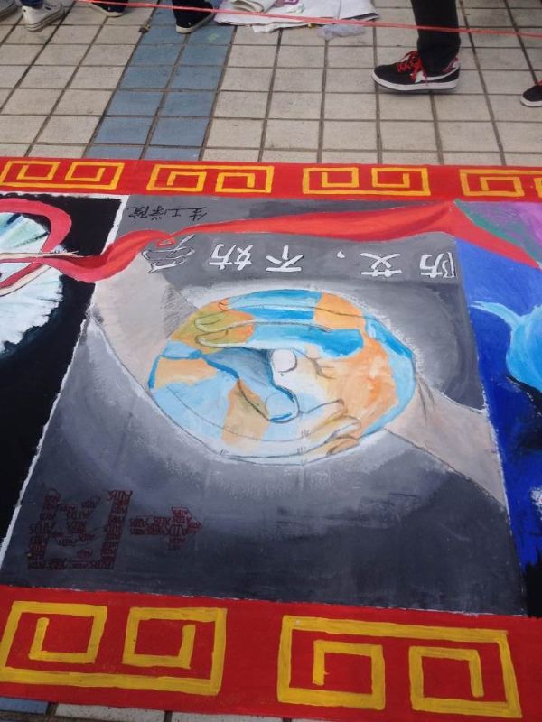 明星AI红十字会会长叶沁带领部员携手宣传部一起完成了这次比赛。作画过程中,在宣传部部长王艺静的带领下,参赛人员积极参与作画,分工有序。王艺静部长介绍,画面上方奔跑的小人冲破浓密的艾滋屏障,找到出口,这表达了我们对同学们能够身体力行,多了解艾滋并有效预防艾滋的一份希冀。下方是两只相握的手,他们来自不同的方向,跨越地球却依旧能够给予彼此力量。飘扬的红丝带与爱相融,无限蔓延,感染着你,感染着我,感染着我们身边的每一个人。这幅画紧紧地扣住了“艾滋病歧视问题”的主题,表达了艾滋病人没有什么不同的理念。