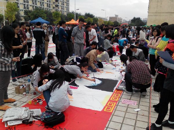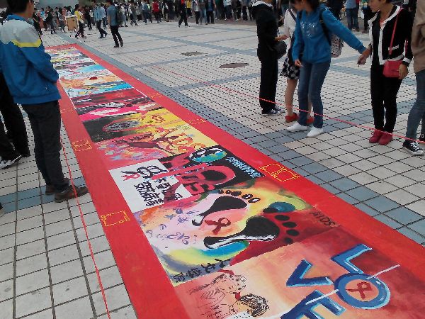 校红十字会在一区青春广场举行了防治艾滋病主题系列活动之“百米画卷”,活动以明星AI