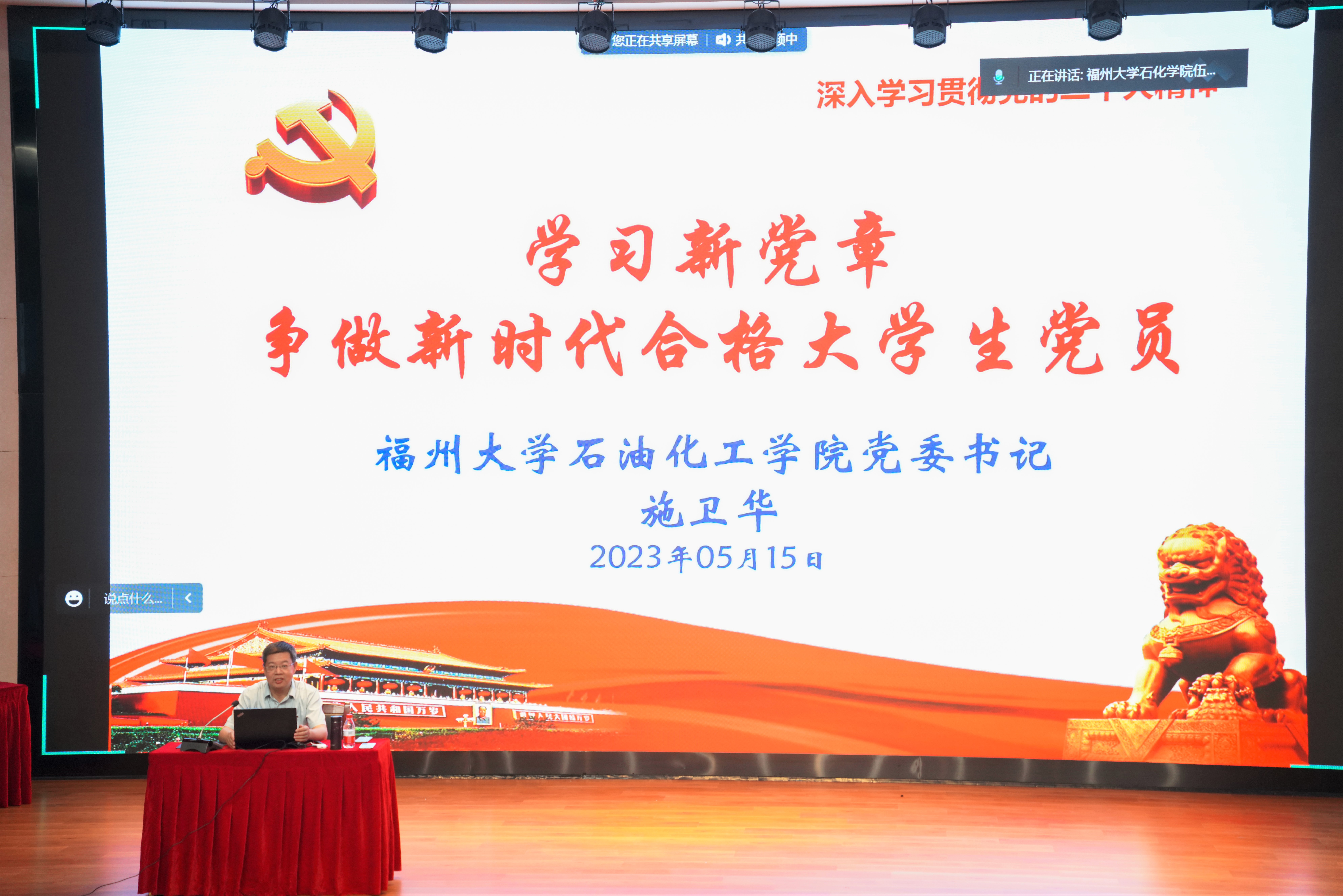 施卫华书记以《学习新党章 争做新时代合格大学生党员》为题,主要围绕“《中国共产党章程》与党员行为规范”、“尊崇《党章》遵守党员行为规范”和“如何成长为新时代合格大学生党员”三个方面,带领同学们深入学习《中国共产党章程》。施卫华书记结合党史视频带领同学追溯党辉煌灿烂的历史,为同学们解读历届党的代表大会对党章修改的深刻内涵与意义。他表示党章是党的总纲领、总章程,并从党章的重要性入手,引导大家学习了党的二十大对党章的修订内容,并要求广大学员提高思想认识,逐字逐句认真学习党章,指导自身的学习、科研和工作。
