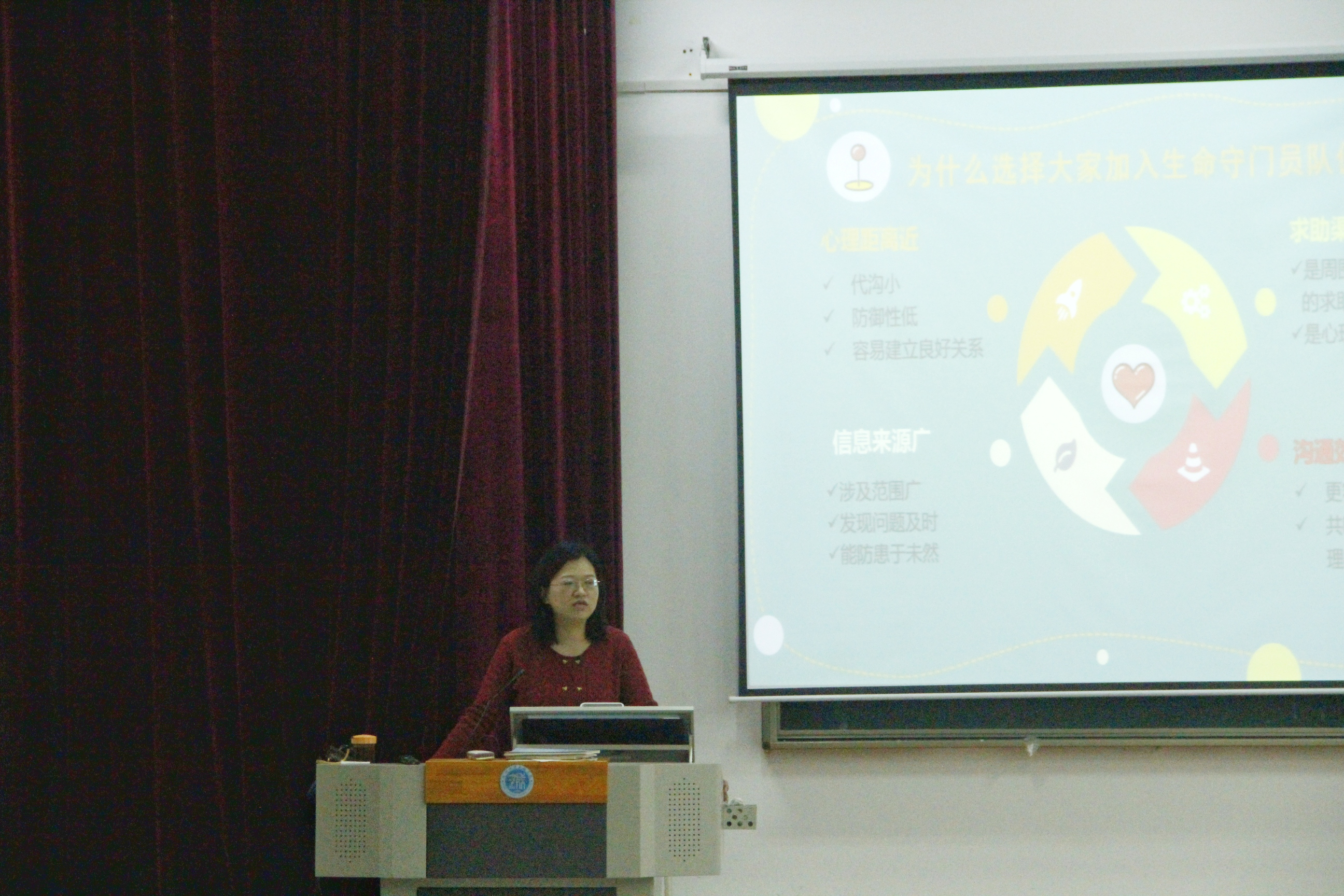 在本次讲座中,陈荟芳老师给本科生们清晰讲述了生命守门员的职责所在。作为生命守门员,我们需要从各种渠道获知同学的心理健康状况,推测其有无自杀倾向。我们可以从一些社交平台上关注有心理问题的同学的心理动向,也可以在生活某些不寻常的细节中捕捉异常。