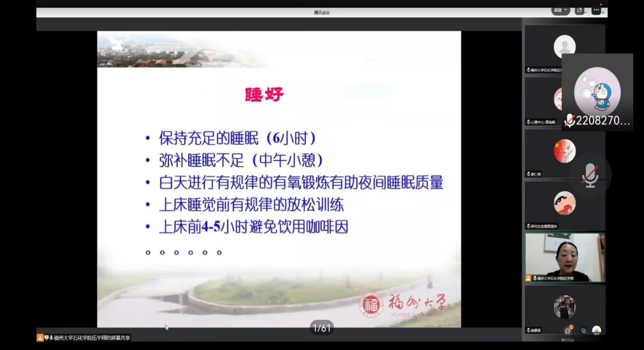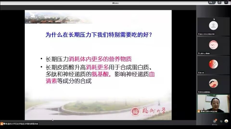 赵陵波教授通过线上直播方式举办心理健康讲座,从“心”出发,为研究生新生做好心理调适,帮助研究生新生提升心理健康素养,加快适应新阶段的学习生活。讲座中,赵陵波教授罗列学习、生活中可能面临的压力,并剖析其成因,帮助学生提前做好相应的心理建设。随后他指出,读研最重要的就是心态,并为同学们传授应对压力与促进心理健康的具体策略。