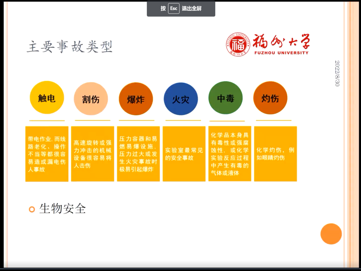 为帮助新生提高自我保护能力,尽快适应大学的学习氛围和生活环境。8月29日至30日,校保卫处江宏老师、天津大学詹启生教授、实验室朱秋享主任通过线上授课方式为2022级本科新生开展了新生教育系列讲座。