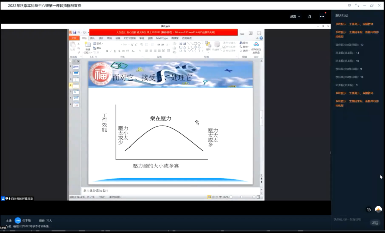9月5日晚,白丽英老师通过腾讯会议在线上为2022级本科新生开展了一场关于幸福与热爱的心理教育讲座。讲座上,老师以一条压力曲线为引,通过疫情当下人们的心理以及学生们在学习上工作上的行为模式,讲解了当代青年在生活学习中遇到挫折与烦恼时调节心理状态的方法。希望通过此次讲座,同学们能够自我调控,以更加良好的状态迎接即将到来的大学生活。